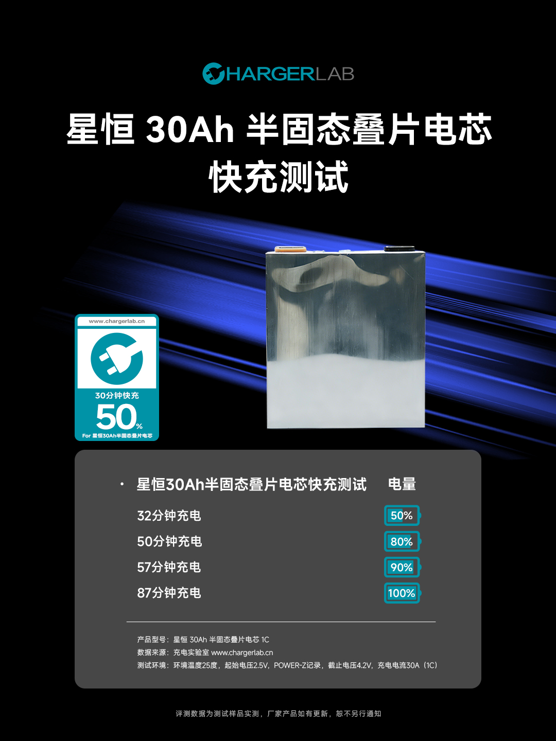 32分钟充入15Ah!星恒 30Ah 半固态叠片电芯充电测试