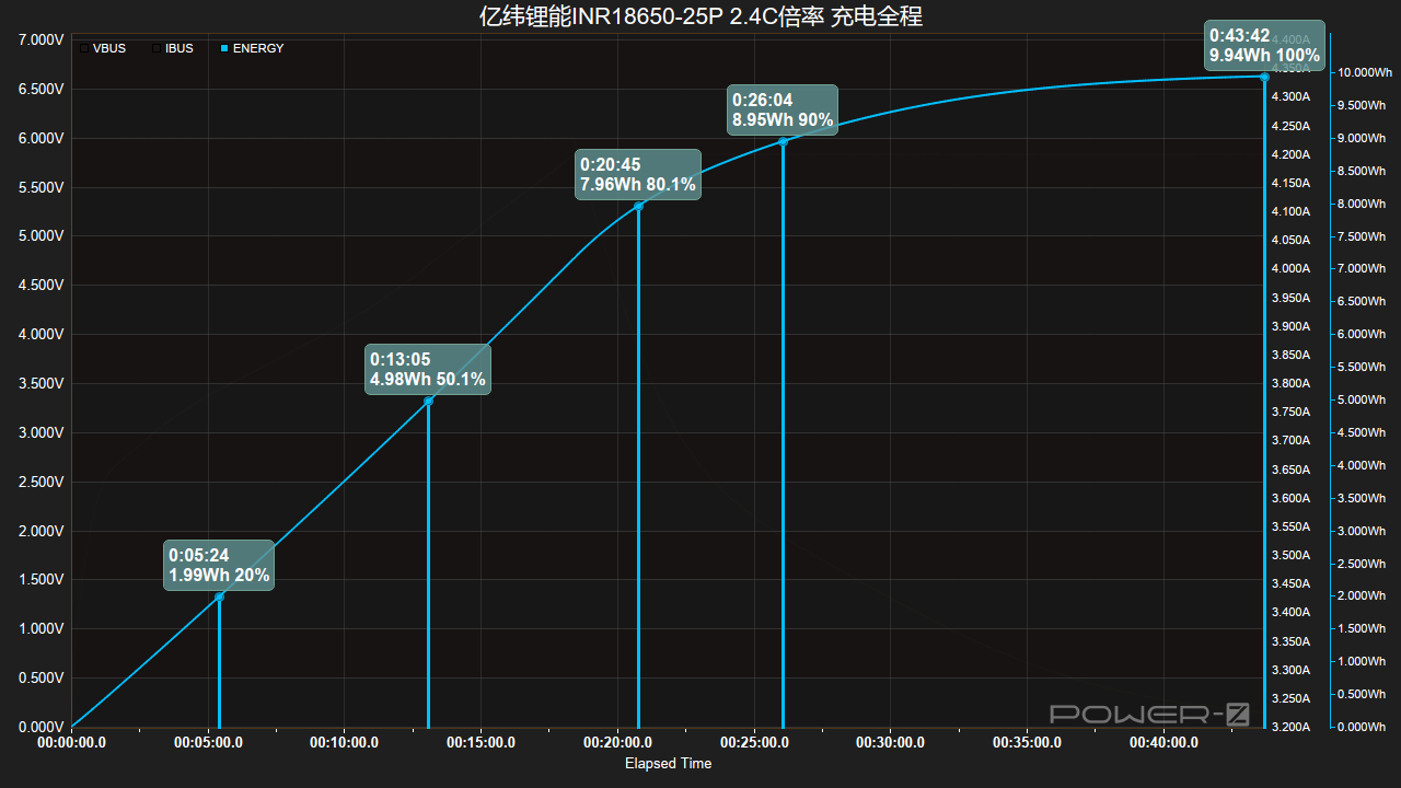 电量曲线方面,可以看到充至20%用5分钟,充至50%用时13分钟,同时充入能量为4.98Wh,第20钟充入电量80%,充入能量7.96Wh,完全充满则需43分钟,完全充满能量为9.94Wh。