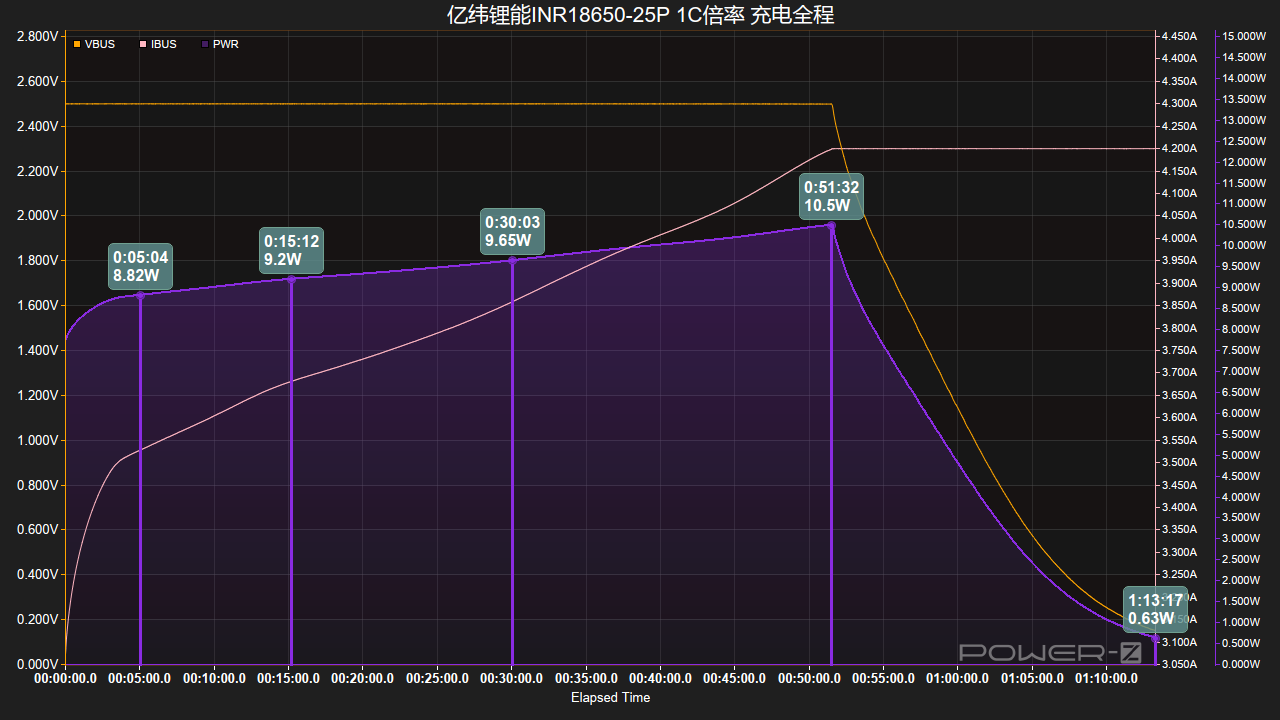 接通电源后,电压、功率持续上升,在51分钟左右功率达到10.5W峰值,同时功率持续下降并进入涓流充电,22分钟后充电完成,总耗时1小时13分钟。