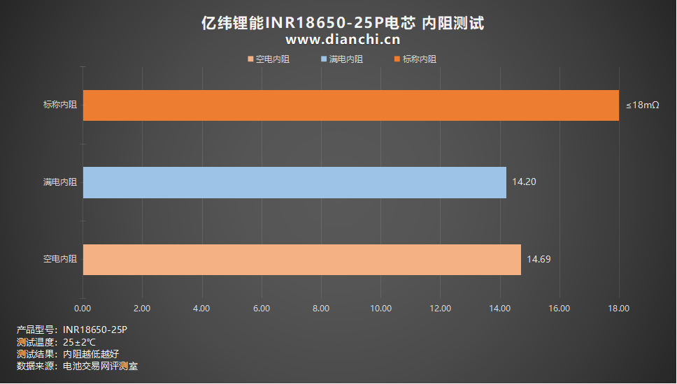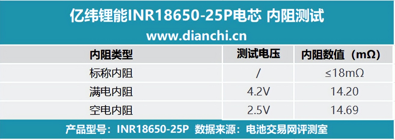 将测试数据汇总至表格,可以看到满电内阻电压为 4.2V,空电内阻电压则为 2.5V,亿纬锂能INR18650-25P电芯标称内阻为 ≤18mΩ。