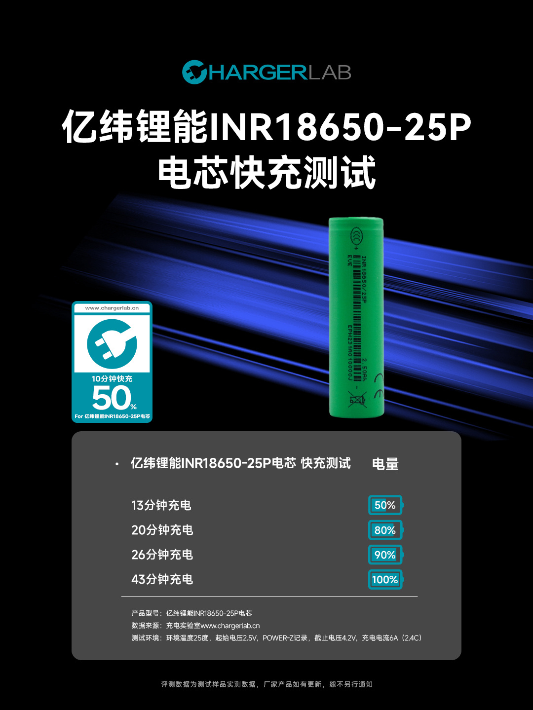 经测试,亿纬锂能INR18650-25P电芯在6A(2.4C)电流下,通过 ChargerLAB 充电实验室的1050快充测试,表现优异。