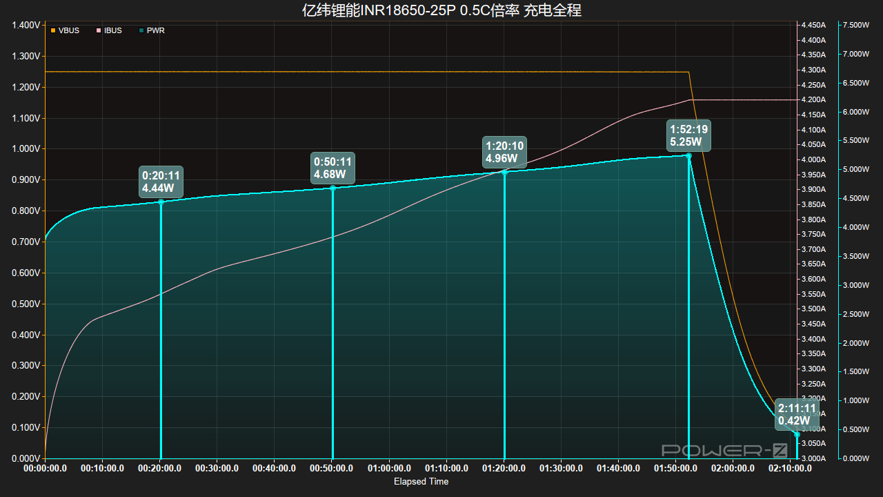 接通电源后,电压、功率持续上升,在1小时52分钟左右功率达到5.25W峰值,同时功率持续下降并进入涓流充电,19分钟后充电完成,总耗时2小时11分钟。