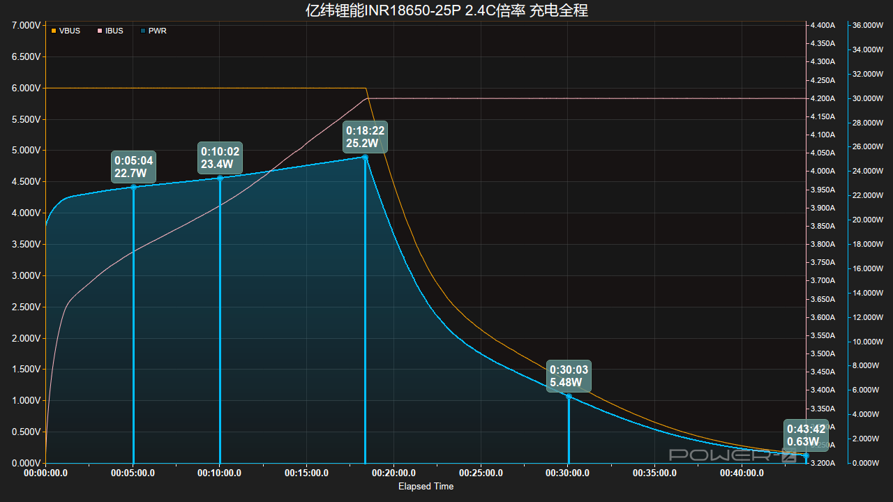 接通电源后,电压、功率持续上升,在18分钟左右功率达到25.2W峰值,同时功率持续下降并进入涓流充电,25分钟后充电完成,总耗时43分钟。
