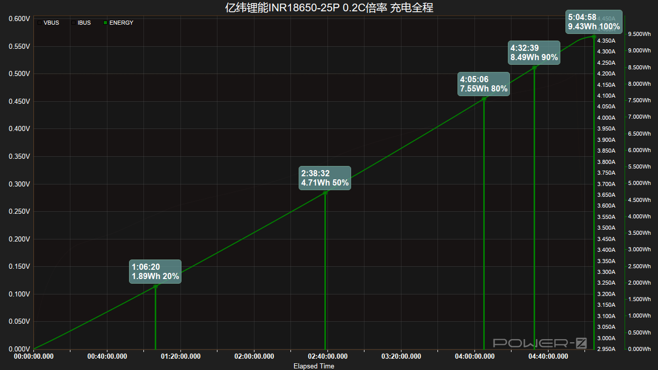 电量曲线方面,可以看到充至20%用1小时6分钟,充至50%用时2小时38分钟,同时充入能量为4.71Wh,第4小时05分钟充入电量80%,充入能量7.55Wh,完全充满则需5小时04分钟,完全充满能量为9.43Wh。