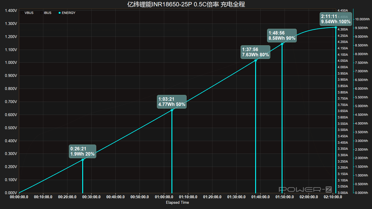 电量曲线方面,可以看到充至20%用26分钟,充至50%用时1小时03分钟,同时充入能量为4.77Wh,第1小时37分钟充入电量80%,充入能量7.63Wh,完全充满则需2小时11分钟,完全充满能量为9.54Wh。