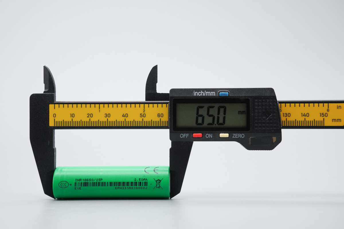使用塑胶卡尺测得电芯高度约为 65mm。