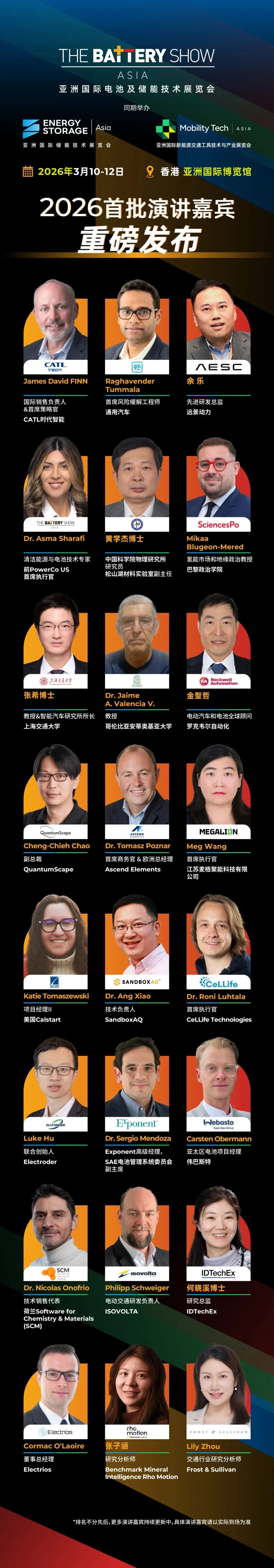 倒计时80天!2026 The Battery Show Asia(亚洲国际电池及储能技术展览会),这场同步联动 “亚洲国际储能技术展览会”“亚洲国际新能源交通工具技术与产业展览会” 的全产业链盛会,再释重磅筹备进展 —— 首批专家顾问团正式发布,为展会注入更专业的行业智识支撑,将于登陆香港亚洲国际博览馆。