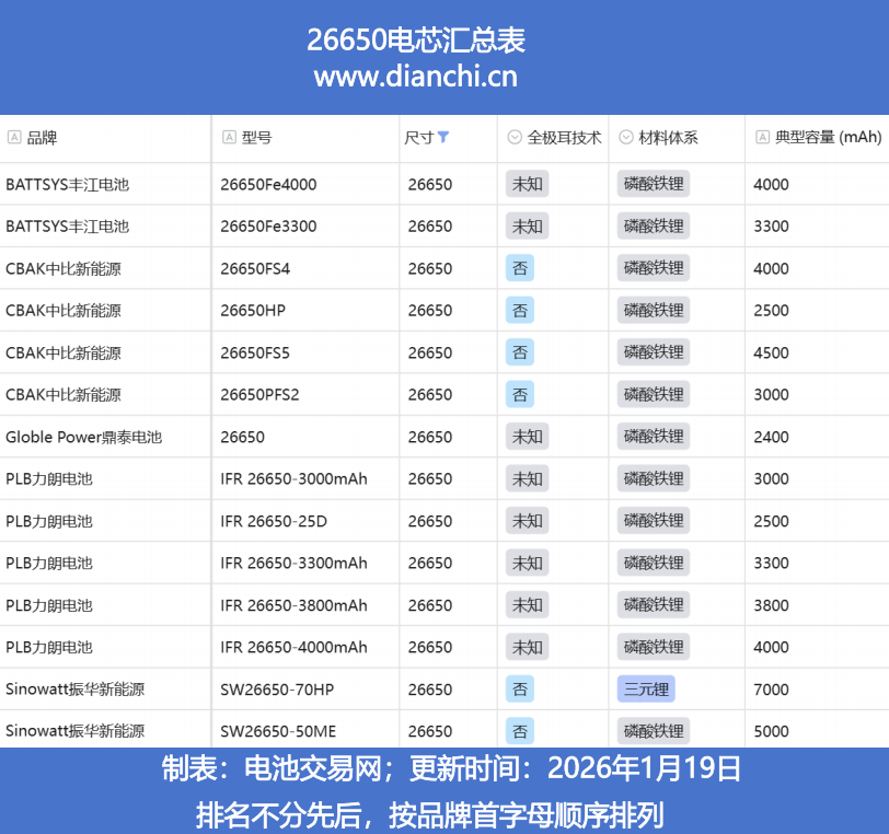 据电池交易网分析,表格中显示的是14款26650电芯,26650是指直径 26mm、高度 65mm 的中尺寸圆柱电芯规格,这类电芯覆盖了磷酸铁锂、三元锂两种材料体系,是兼具不同性能属性的中尺寸圆柱电芯品类,覆盖 2500mAh-7000mAh,是适配不同场景需求的中尺寸电芯选型之一。
