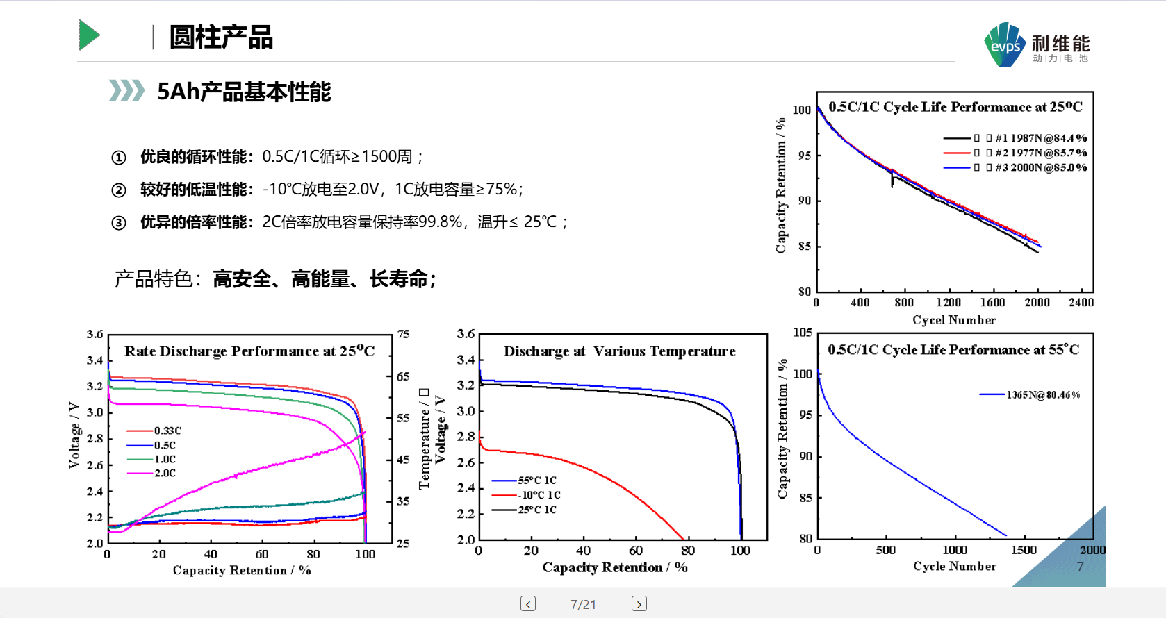 该款电芯标准电压3.20V、容量5.0Ah,设计之初便精准契合移动电源对安全性、循环寿命与能量密度的综合需求。测试数据显示,其循环性能优良,0.5C/1C循环可达1500周以上,低温性能与倍率性能表现突出,凸显高安全、高能量、长寿命的核心产品优势。