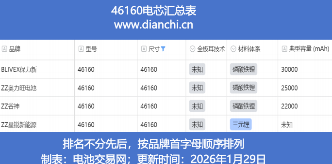 据电池交易网分析,表格中显示的是3款46160电芯,46160 是指直径 46mm、高度 160mm 的超大尺寸圆柱电芯规格,属于大尺寸圆柱电芯阵营中聚焦大容量的细分品类。