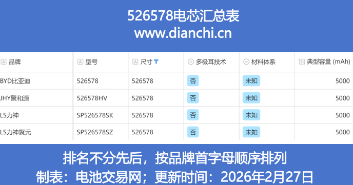 据电池交易网分析,表格中显示的是4款526578电芯,526578 是指厚度 5.2mm、宽度 65mm、长度 78mm 的中型软包电芯,属于消费电子与便携设备领域的主流供电选型。