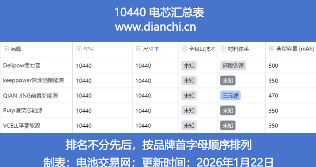 据电池交易网分析,表格中显示的是5款10440电芯,10440 是指直径 10mm、高度 44mm 的微型圆柱电芯,尺寸与 AAA 干电池完全一致,是微型便携设备领域的专属供电选型。典型容量仅为 350mAh-500mAh,整体呈现 “微型、低成本、基础适配” 的市场定位。