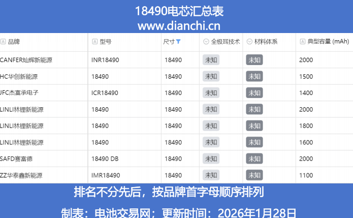 据电池交易网分析,表格中显示的是8款18490电芯,18490 是指直径 18mm、高度 49mm 的小型圆柱电芯规格,是介于 18350 与 18650 之间的过渡性尺寸选型。