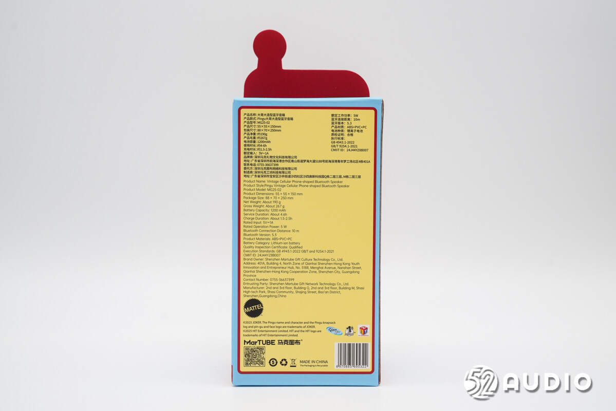 包装盒背面介绍的产品信息,产品名称:大哥大造型蓝牙音箱,产品款式:Pingu大哥大造型蓝牙音箱,产品型号:MG25-02,电池容量:1200MAh,使用时长:约4-6小时,充电时长:约1.5-2.5小时,额定输入:5V-1A,品牌商:深圳马克礼物文化科技有限公司,制造商:深圳马克工坊科技有限公司。