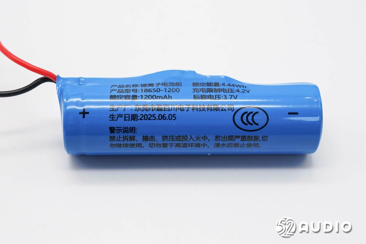 音箱内置锂离子电池组,型号:18650-1200,额定容量:1200mAh,额定能量:4.44Wh,充电限制电压:4.2V,标称电压:3.7V,生产厂:东莞市盈百川电子科技有限公司。
