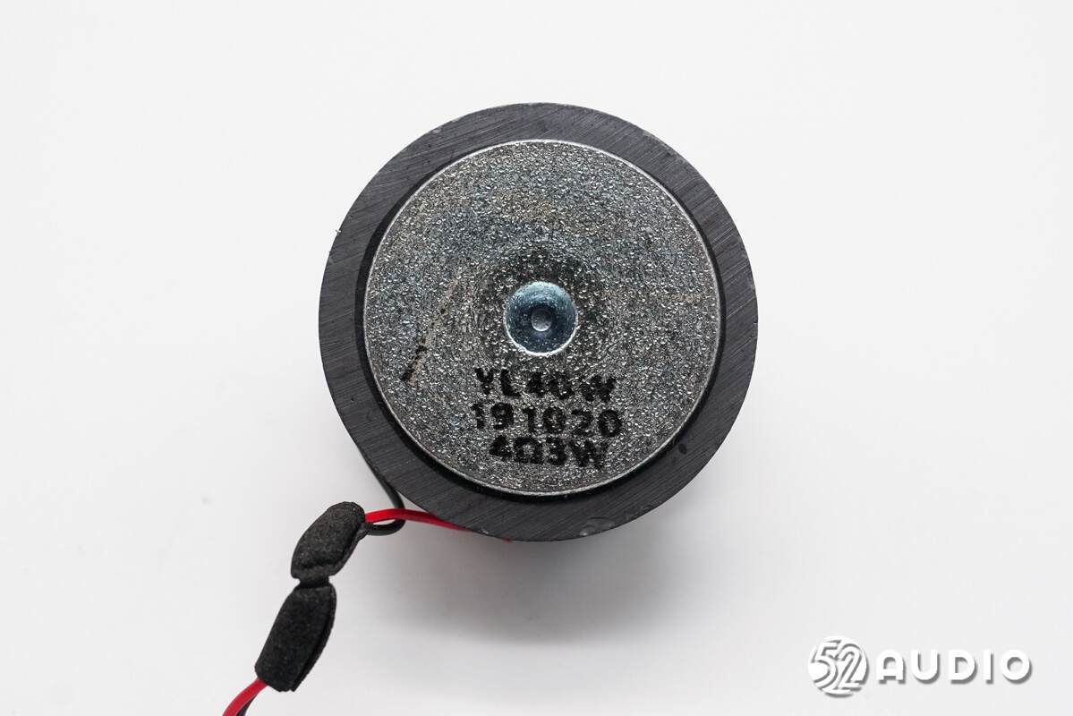 音箱内置动圈喇叭背面T铁特写,丝印参数信息,阻抗:4Ω,功率:3W。