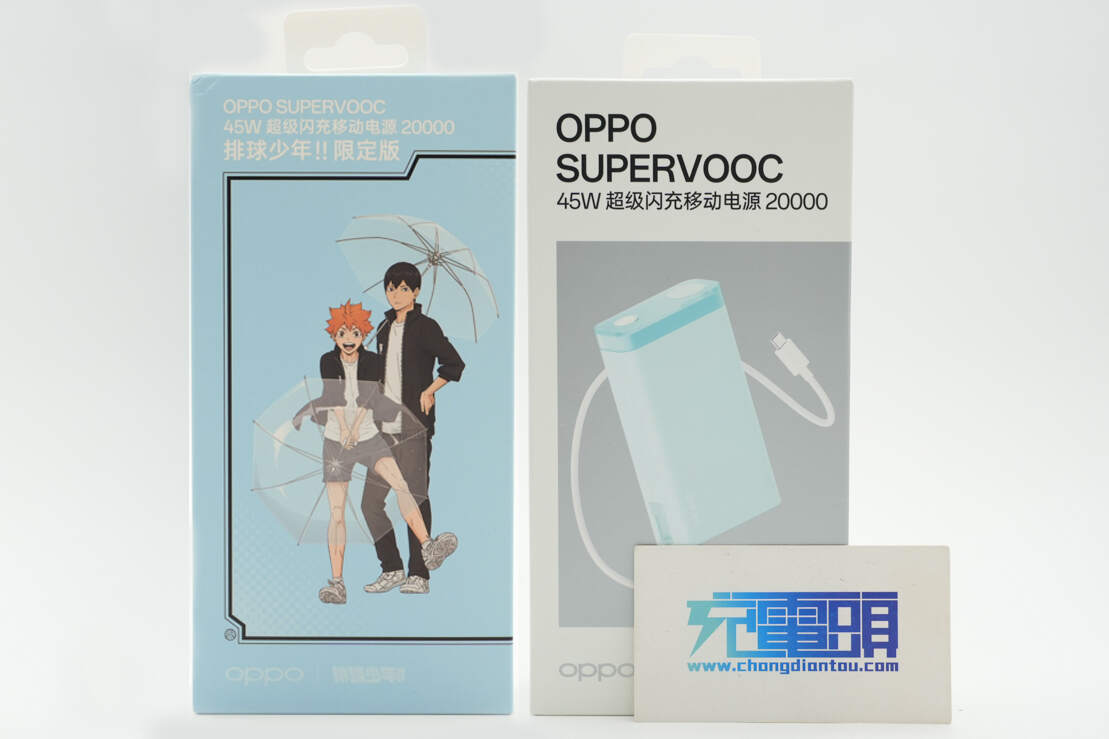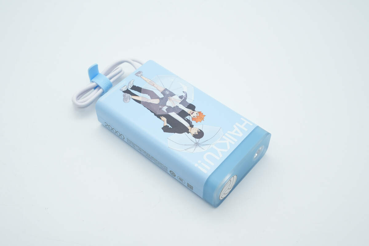 OPPO 45W自带线超级闪充移动电源《排球少年》联名限定版机身上印有主角日向翔阳拿伞的场景图,充满青春活力气息。
