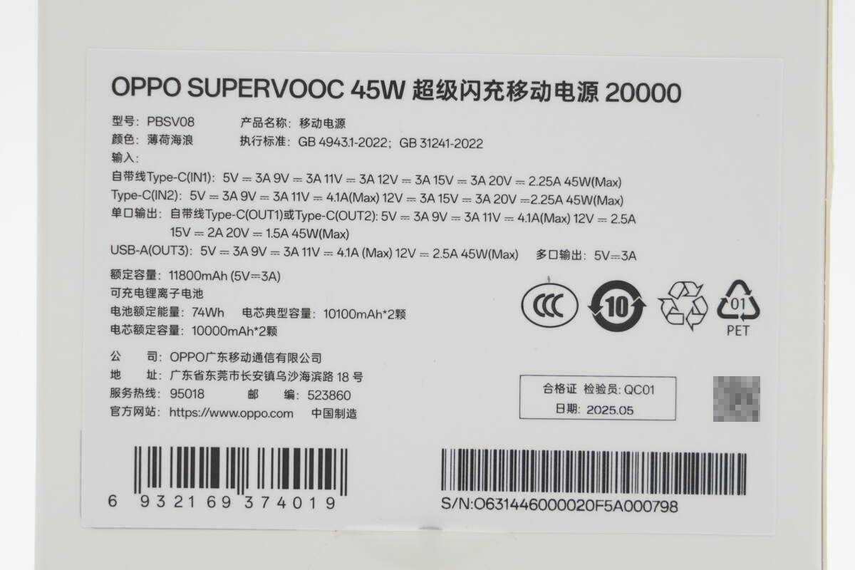 性能方面支持OPPO 45W双向超级闪充以及45W PD输入和30W PD输出,此外还兼容UFCS、PPS、QC3.0快充协议,整体兼容性相当好,不仅满足OPPO系机型快充,苹果、三星、小米等品牌设备也能很好适配。
