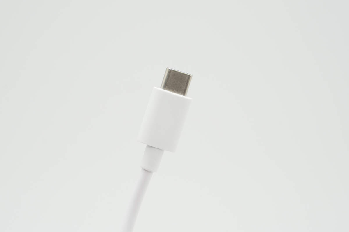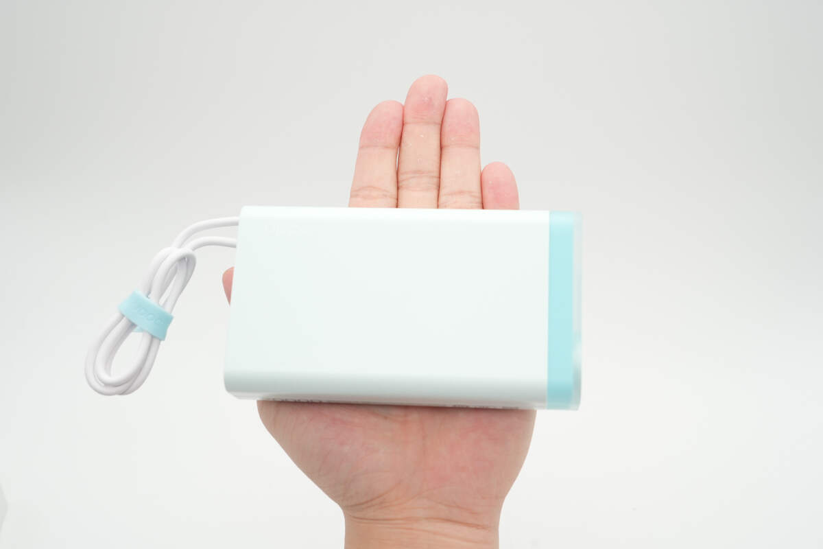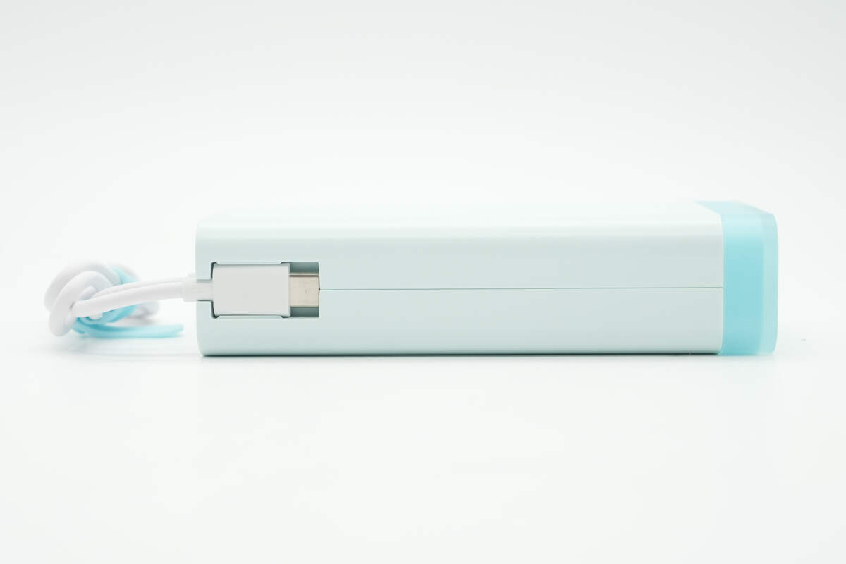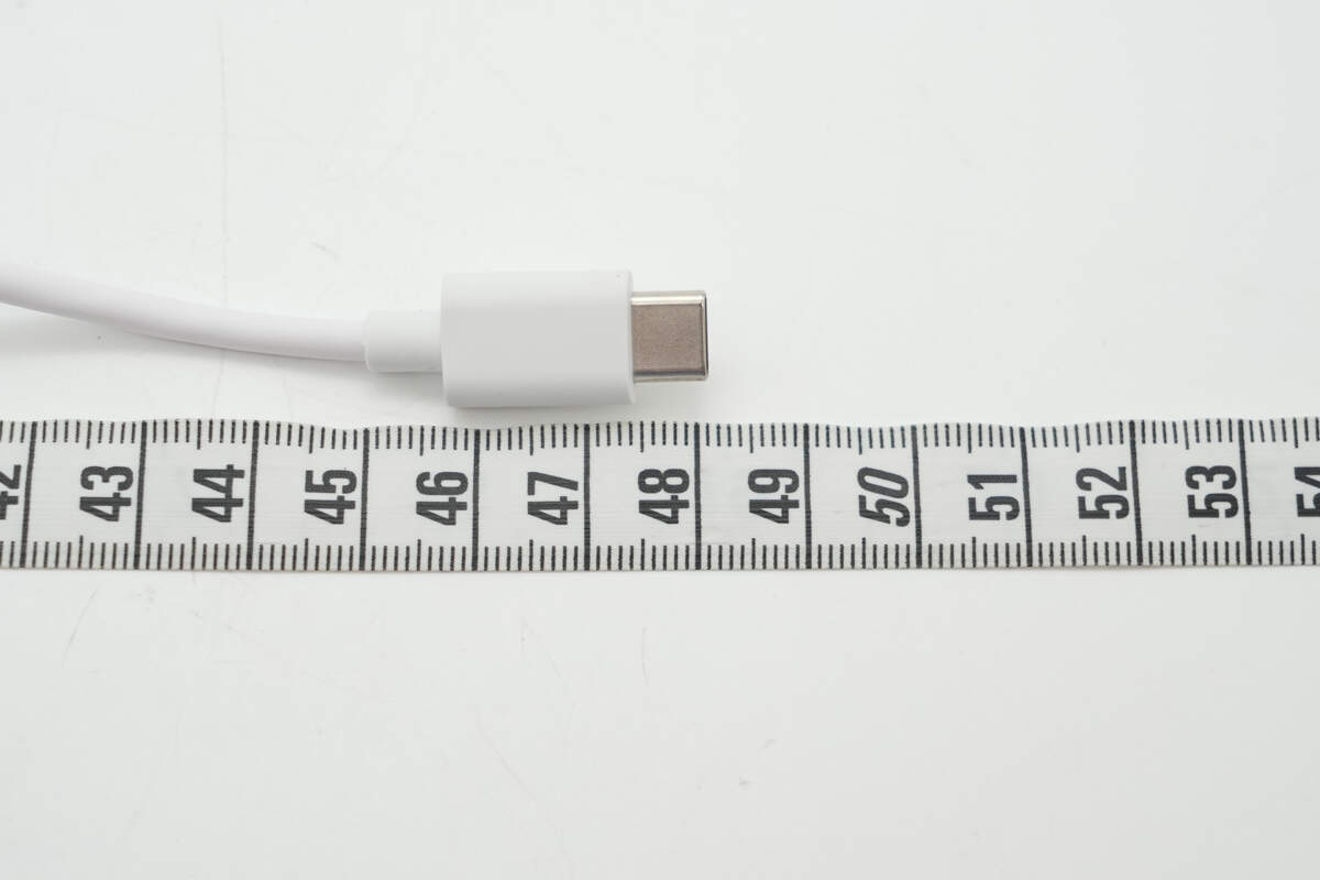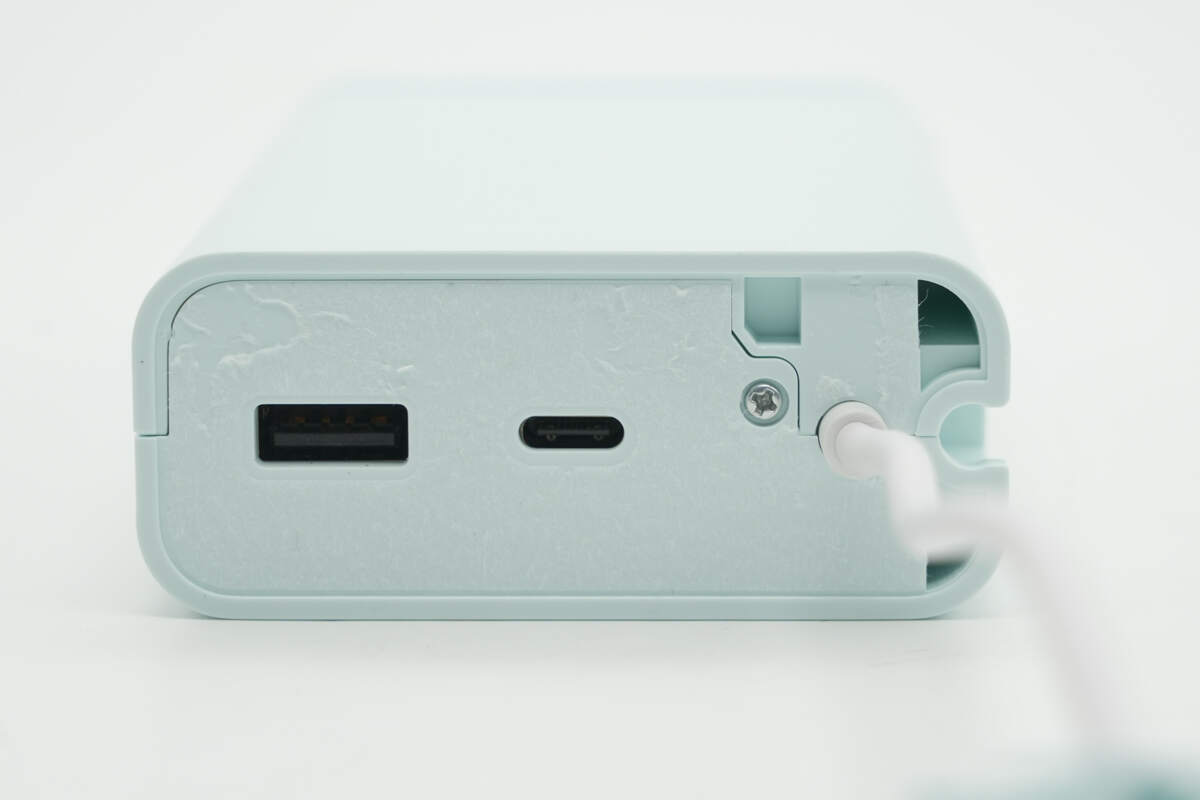 USB-C自带线为经典白色线设计,端子外壳磨砂方便插拔,配合侧面收纳槽,还能当提绳使用。