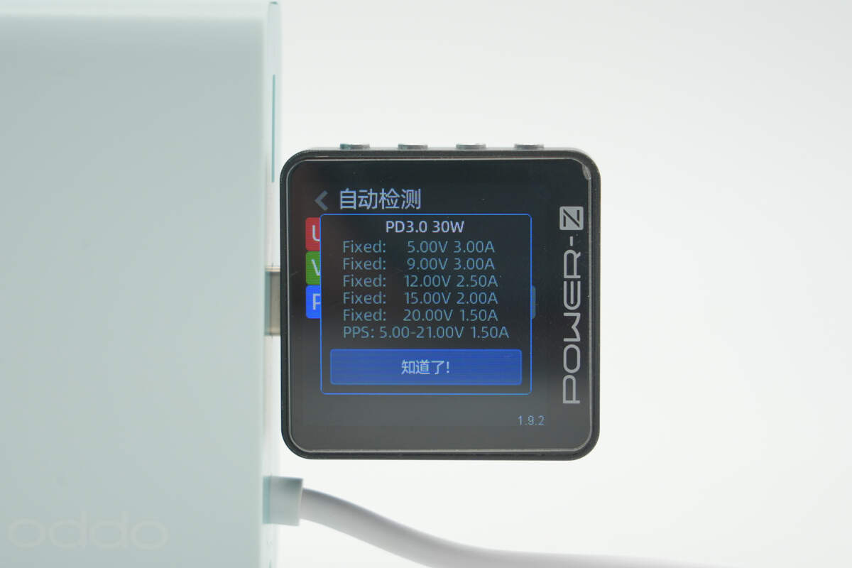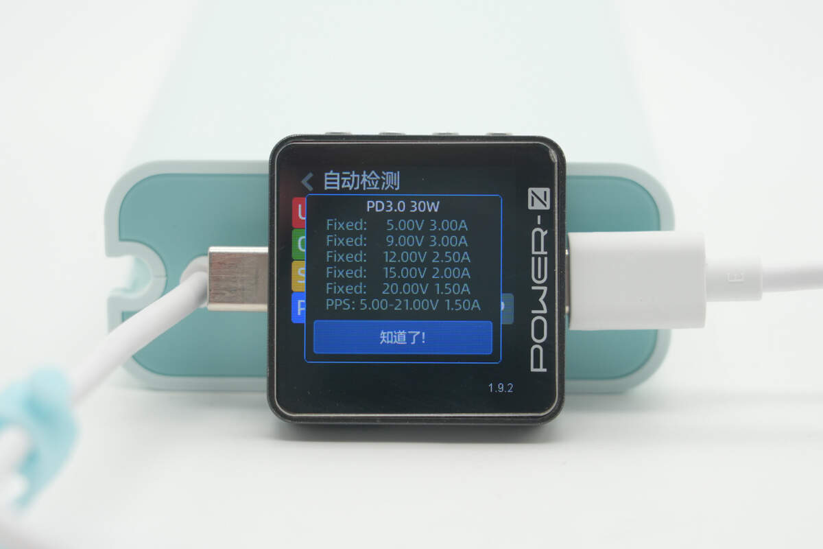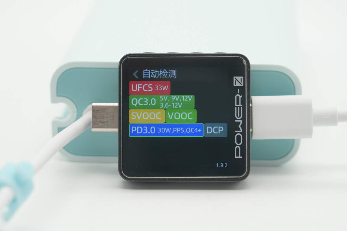 使用ChargerLAB POWER-Z KM003C测得USB-C自带线支持UFCS、QC3.0/4+、SVOOC、VOOC、PD3.0、PPS、DCP充电协议。