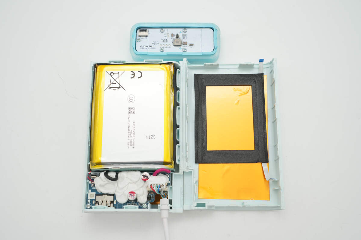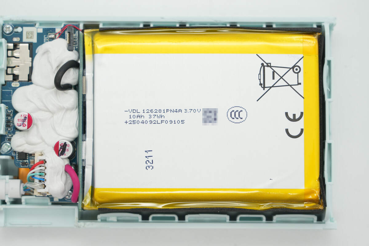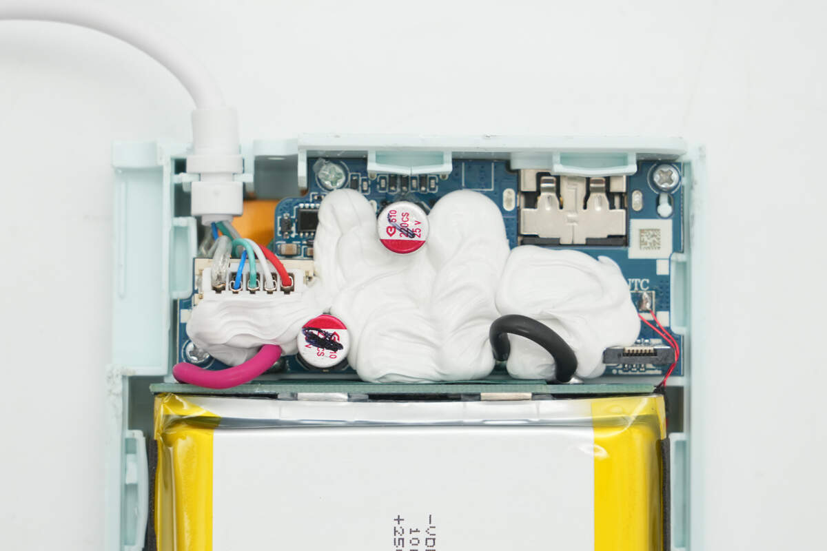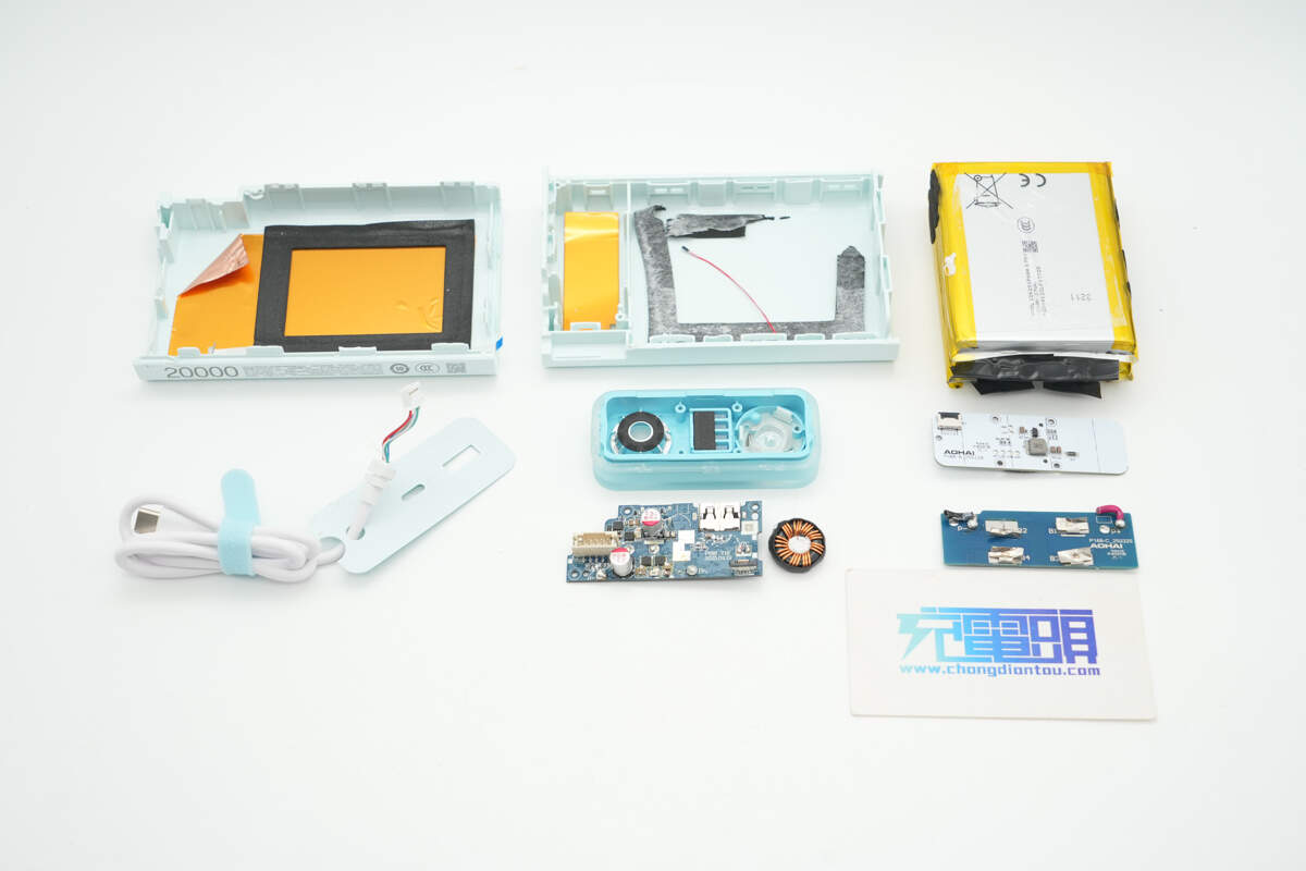 充电头网拆解发现,充电宝内置紫建两块聚合物锂电池,电芯通过了3C强制认证,并配备创芯微CM1025-QA锂电保护方案以及热敏电阻进行保护。壳体内侧贴有散热铜箔为PCB板和电芯散热,并填充缓冲泡棉实现抗冲击,螺丝加固小板。