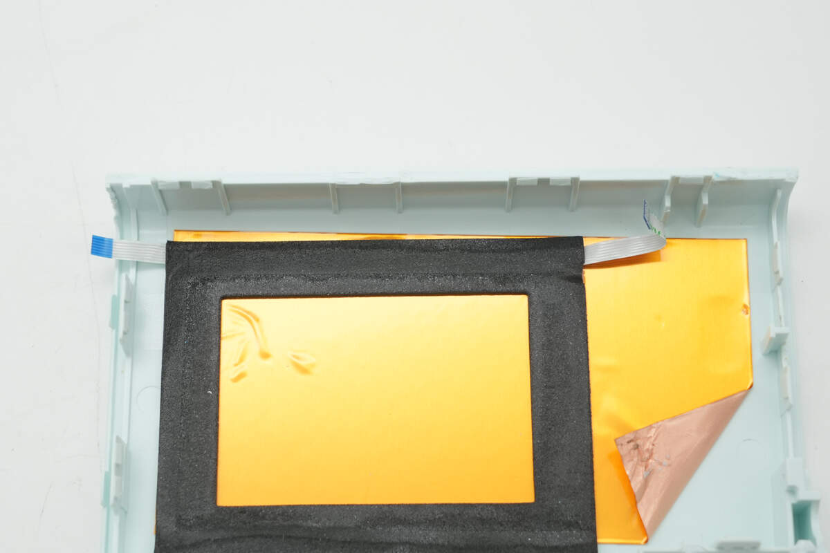 壳体内侧贴有缓冲保护泡棉以及散热铜箔,铜箔做了绝缘保护处理。此外泡棉还顺便粘贴固定连接两端模块的排线。