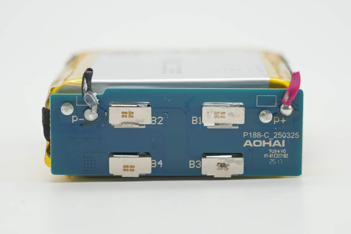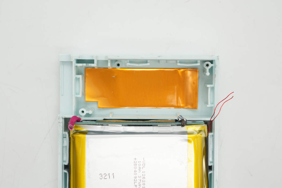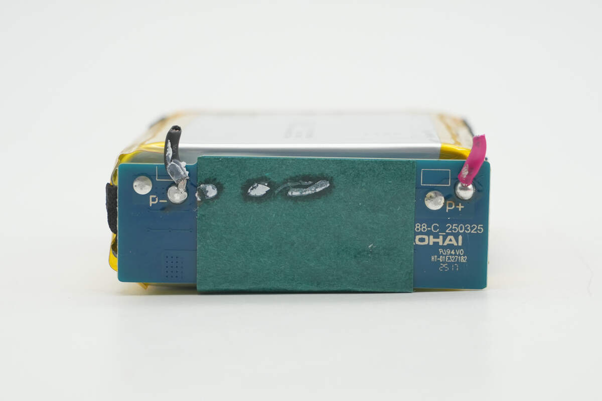 电芯与壳体间填充泡棉抗冲击保护,前端设有锂电保护小板,并通过红、黑导线锡焊连接主控PCB板。