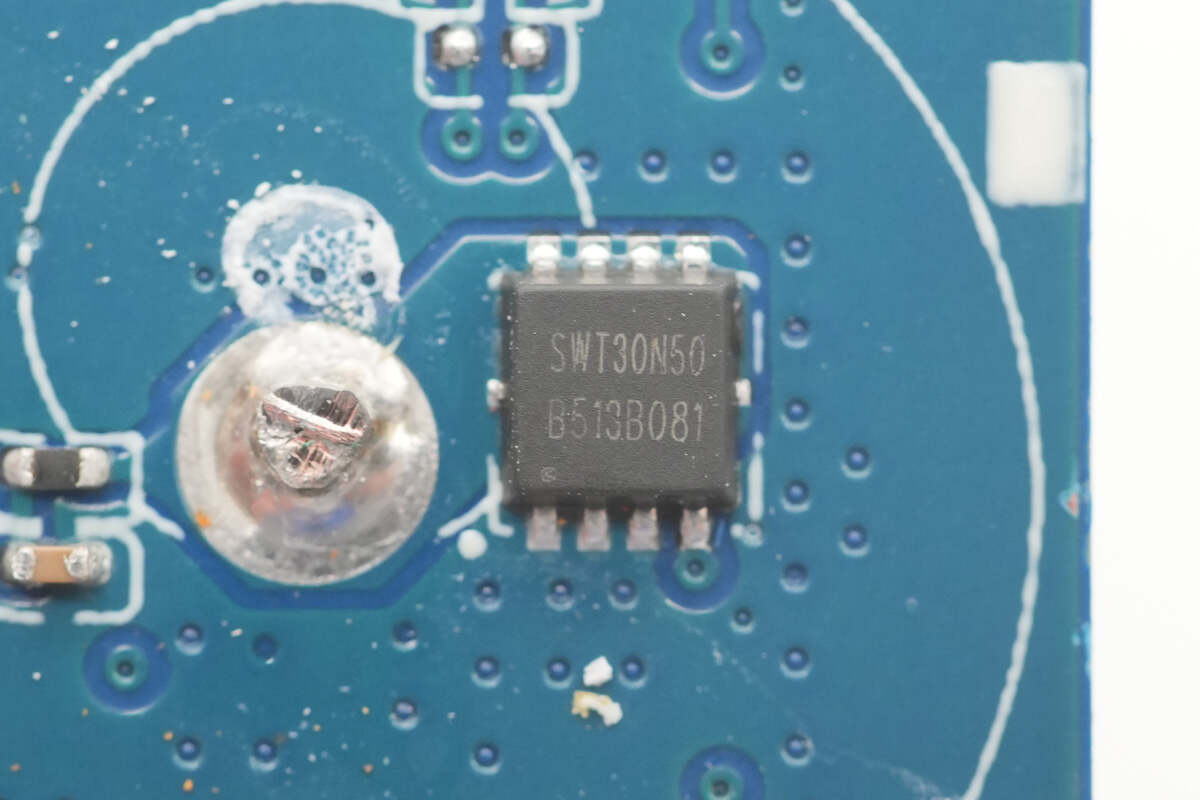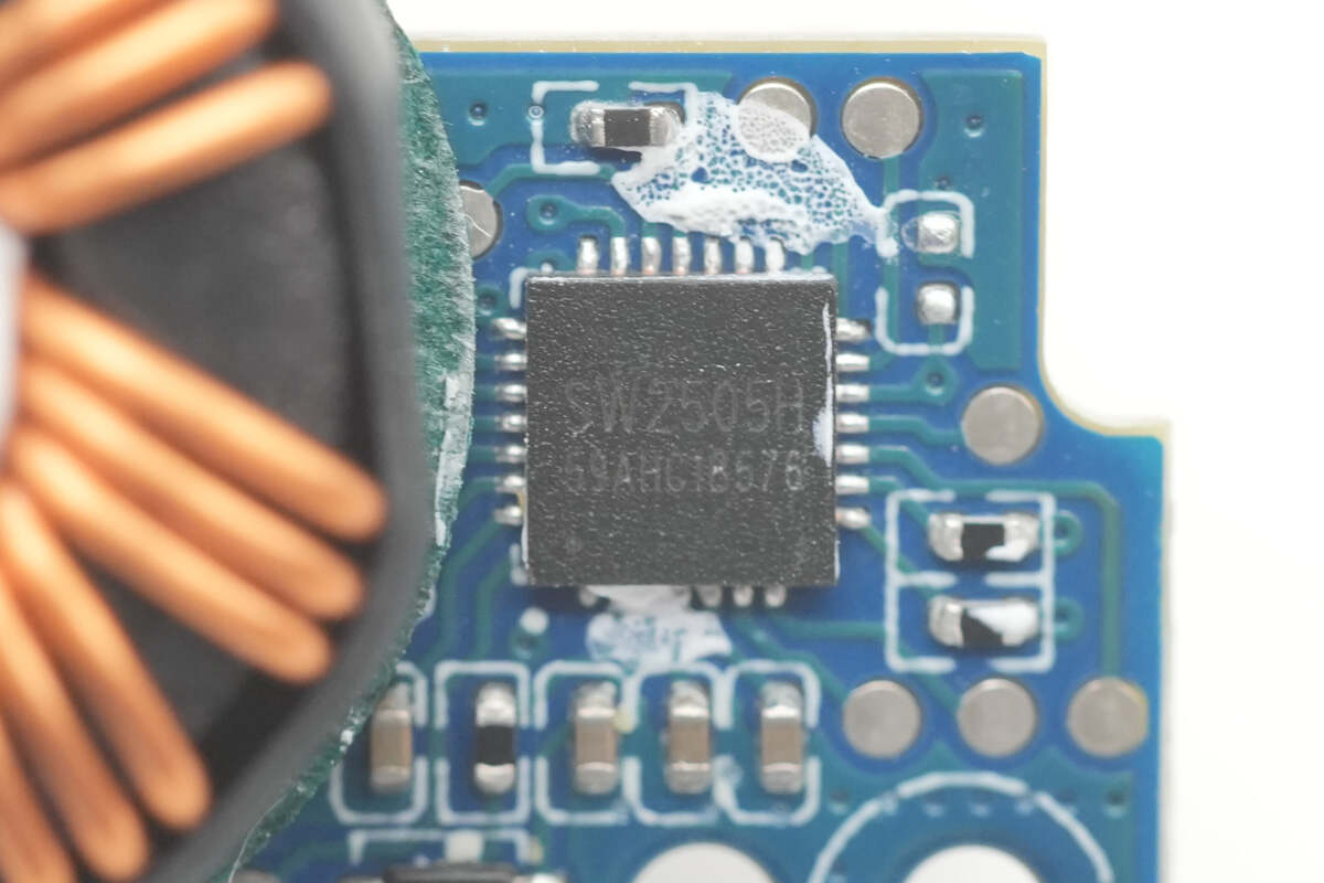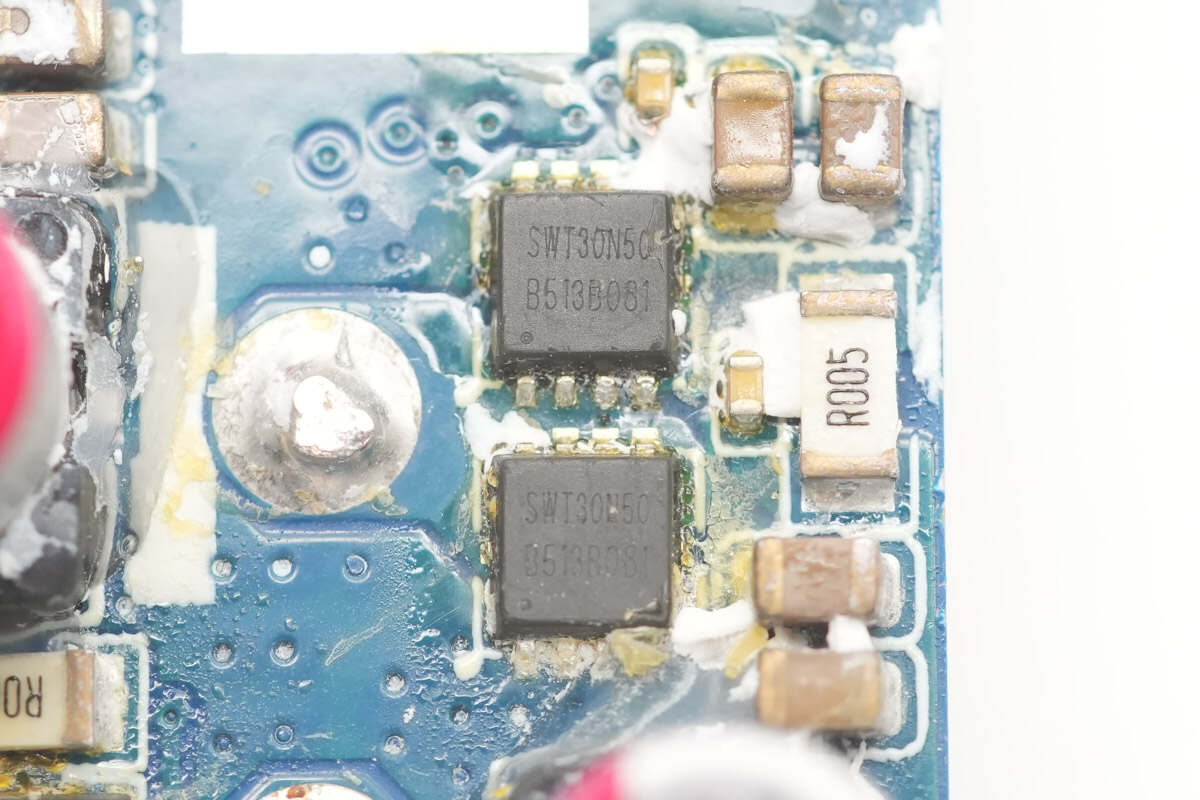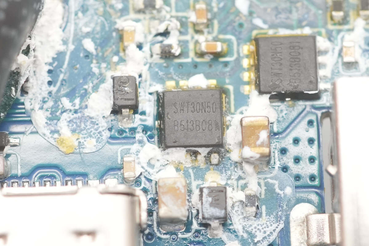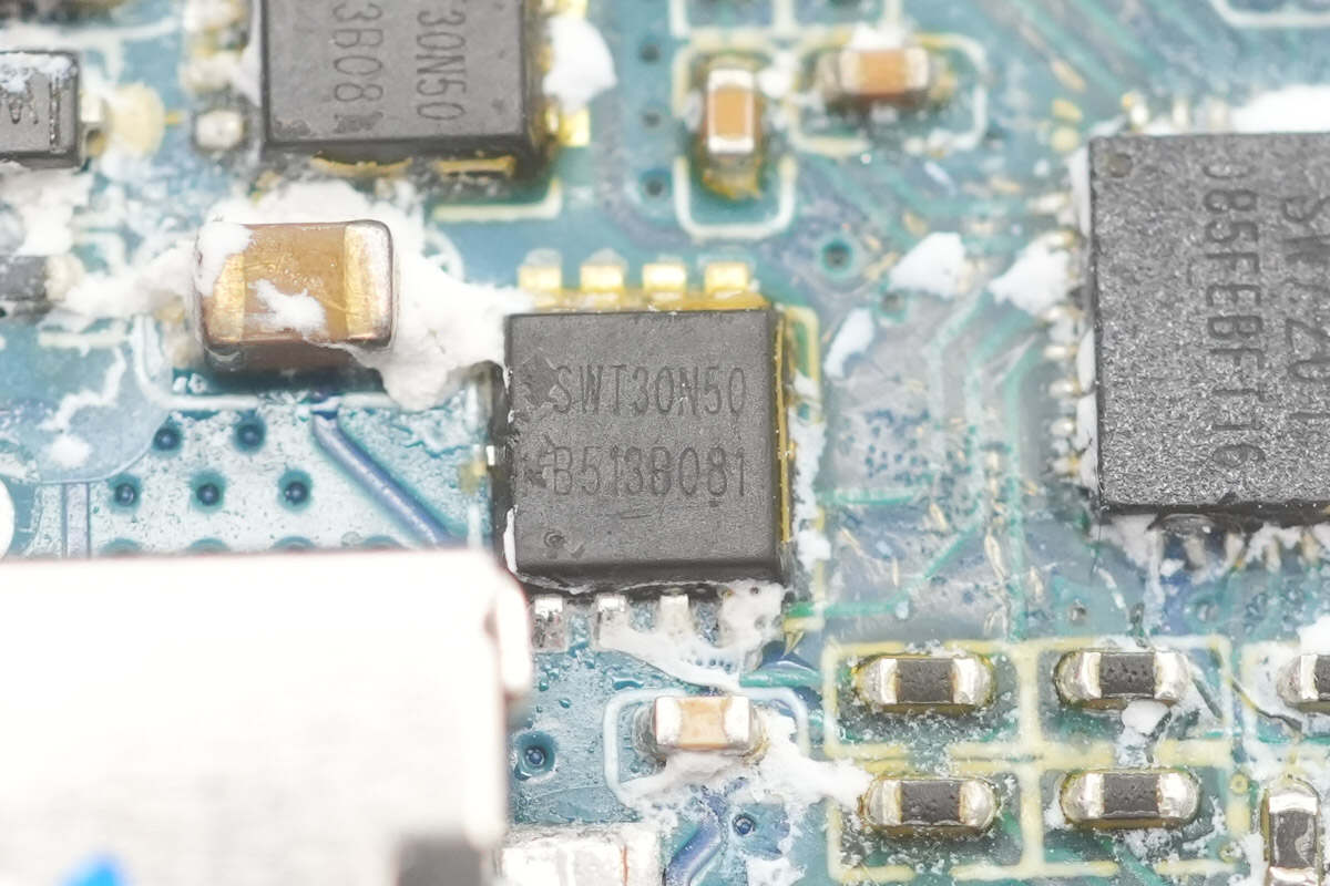 另一颗智融科技SWT30N50同步升降压开关管布局在板子背面。此外USB-C自带线输出VBUS开关管也是采用智融科技SWT30N50。