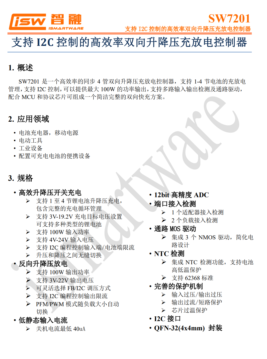 用于电池充放电管理的同步升降压控制器来自智融科技,型号SW7201,这是一个高效率的同步 4 管双向升降压充放电控制器,支持1-4节电池的充放电管理,支持I2C控制,可以提供最大100W的功率输出,支持多路输入输出检测及通路驱动, 配合MCU和协议芯片可组成一个简洁完整的双向快充方案。