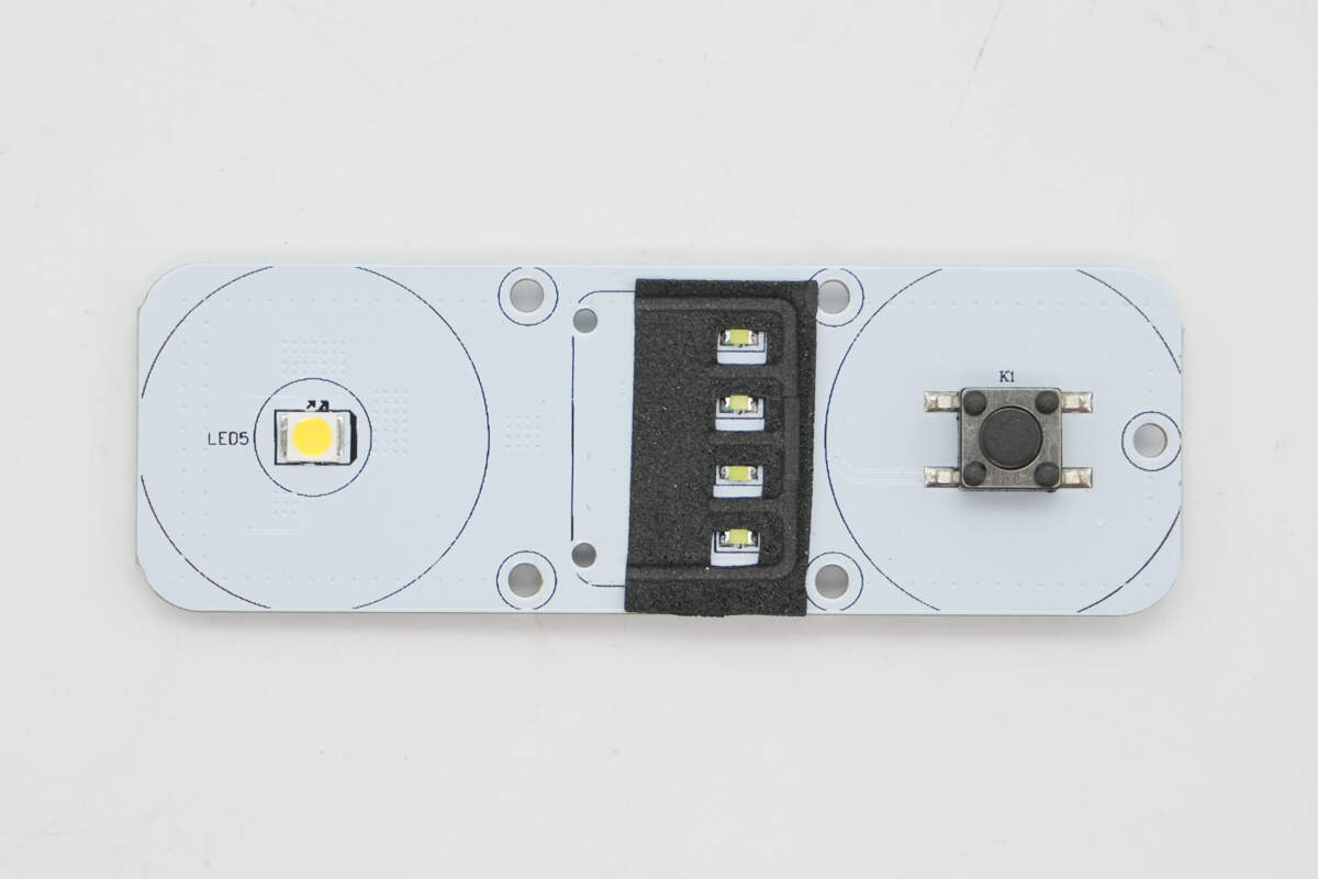 小板正面设有功能按键、LED电量指示灯以及LED照明灯。