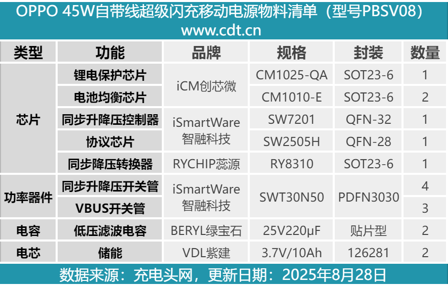最后附上OPPO 45W自带线超级闪充移动电源的核心器件清单,方便大家查阅。