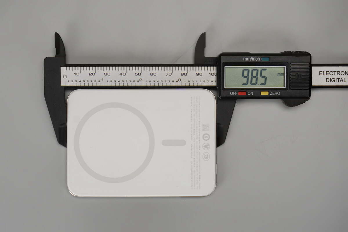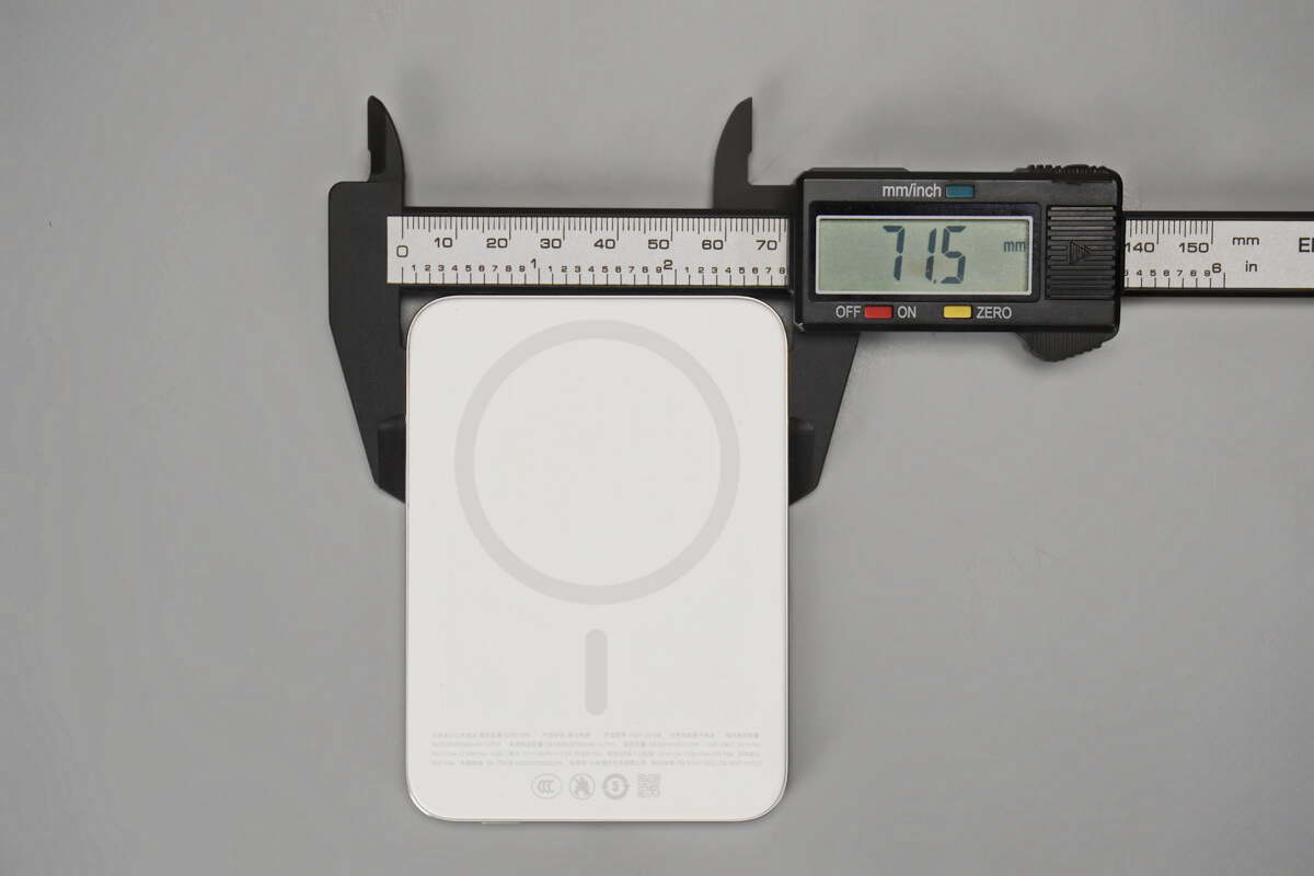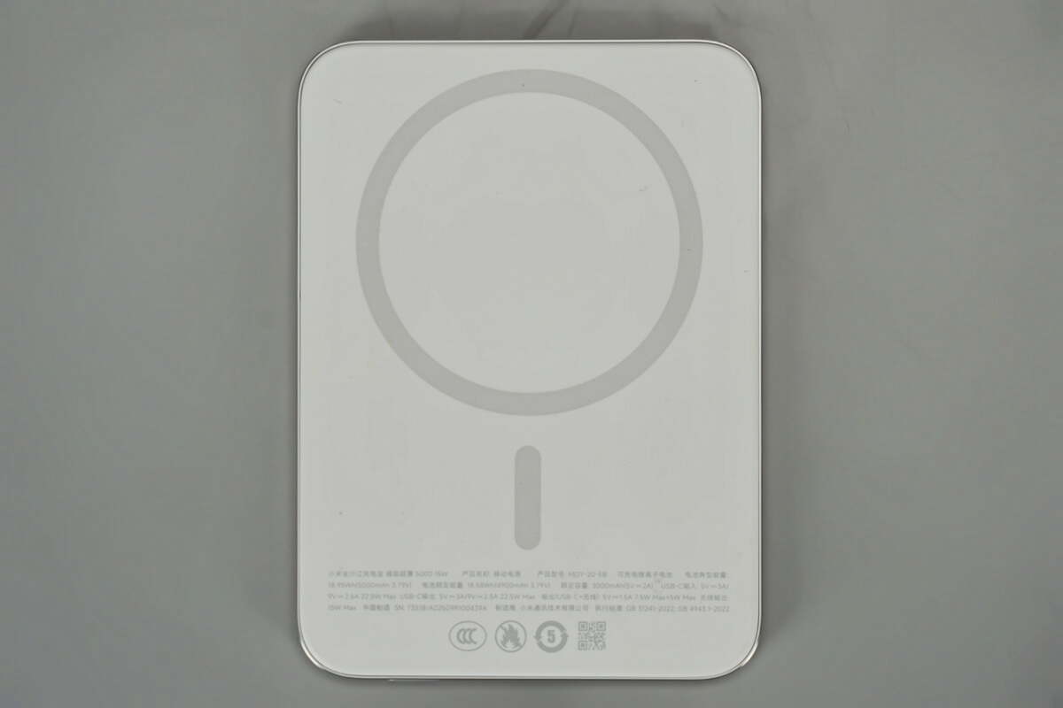 机身正面印有无线充磁铁区域圆环和定位磁铁位置,下方印有充电宝参数。
