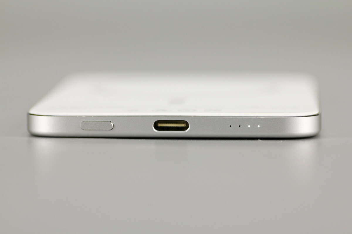 充电宝机身底部设有电源按键,USB-C接口和电量指示灯。