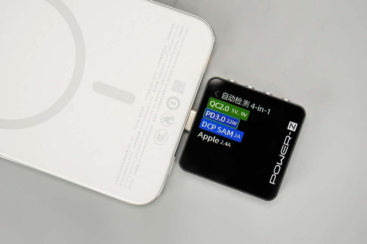 使用ChargerLAB POWER-Z KM003C测得USB-C口支持QC2.0、PD3.0、DCP、SAM 2A、Apple 2.4A充电协议。