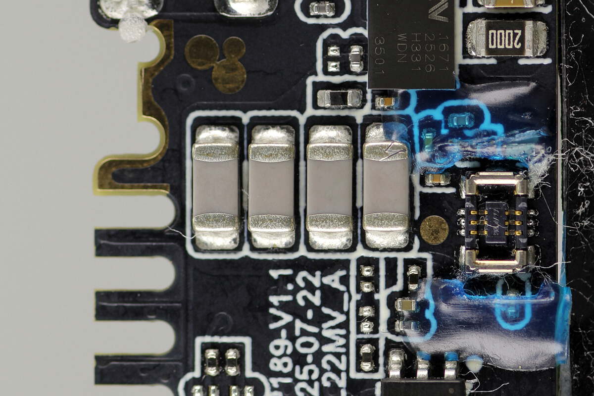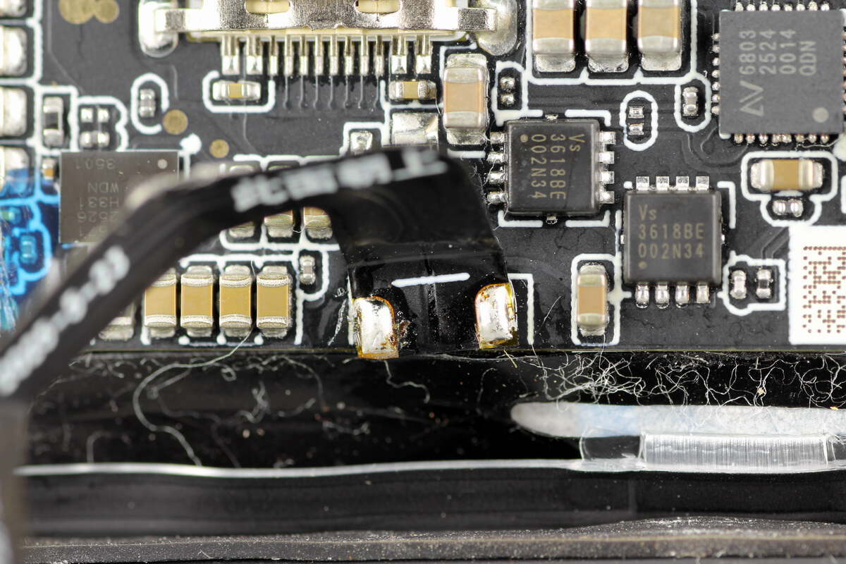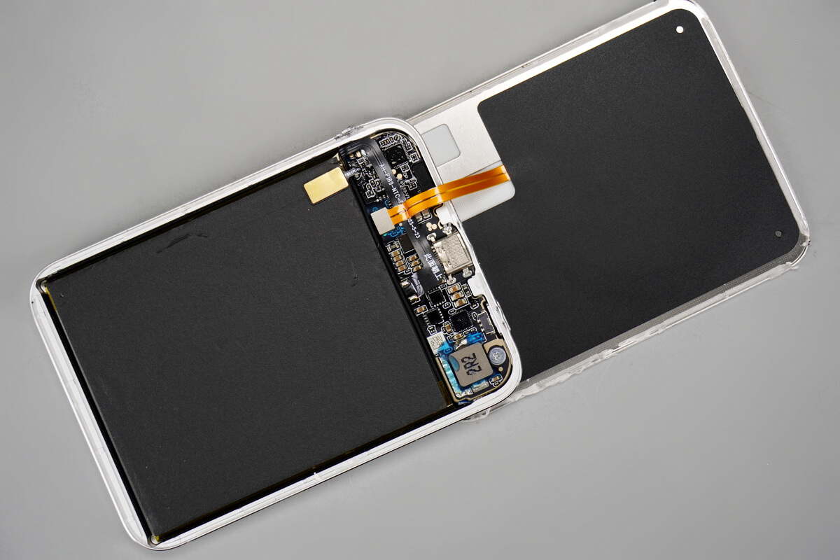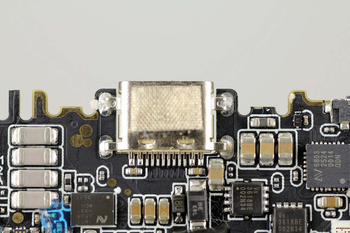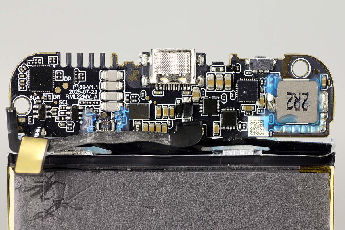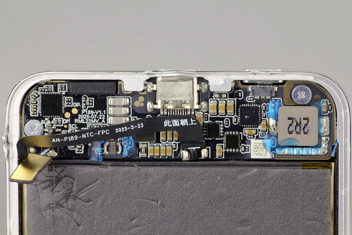 PCBA模块正面一览,左侧设有协议芯片,依次设有NPO谐振电容和无线充电功率级芯片,中间设有USB-C母座,右侧设有VBUS开关管,电源管理芯片和合金电感,热敏电阻排线通过双面胶粘贴固定。