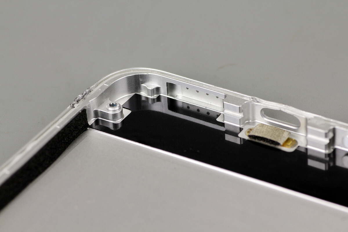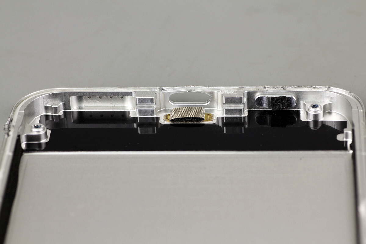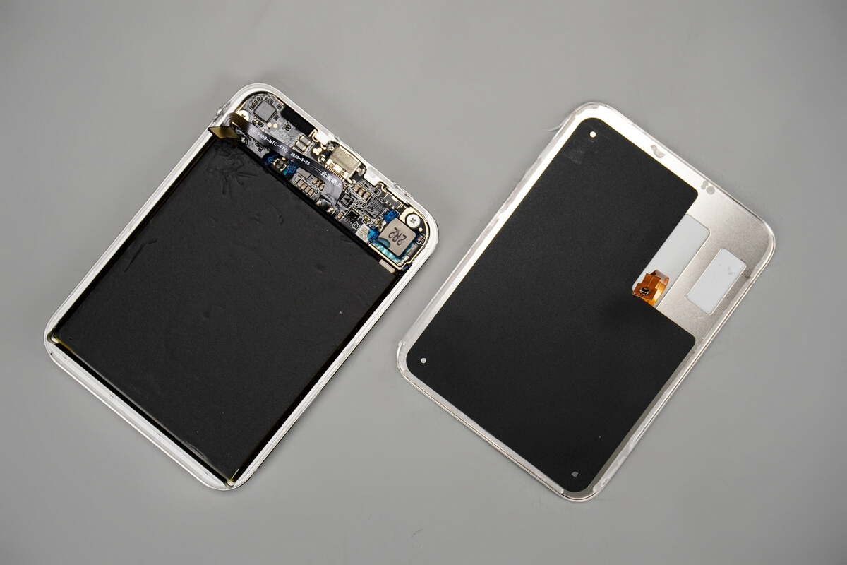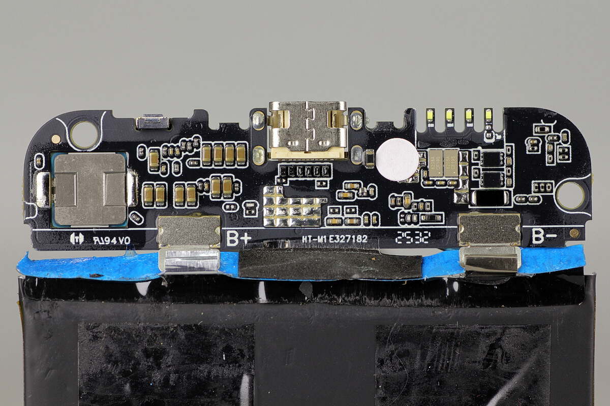 首先揭开充电宝面板,为玻璃纤维材质,底部为不锈钢盖板。