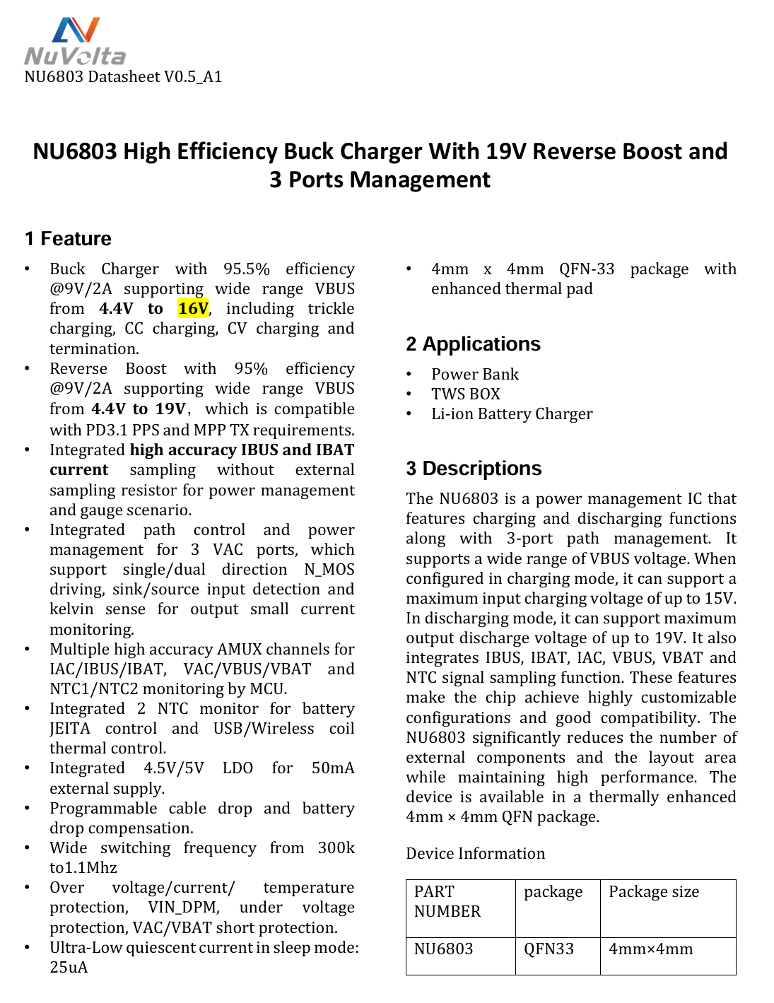 电源管理芯片来自伏达半导体,型号NU6803,是一颗高效同步降压充电芯片,支持19V反向升压输出,并具备三个接口控制。支持4.4-16V输入和4.4-19V输出电压,及完整的锂电池充电管理,兼容PD3.1/PPS和无线充电应用。