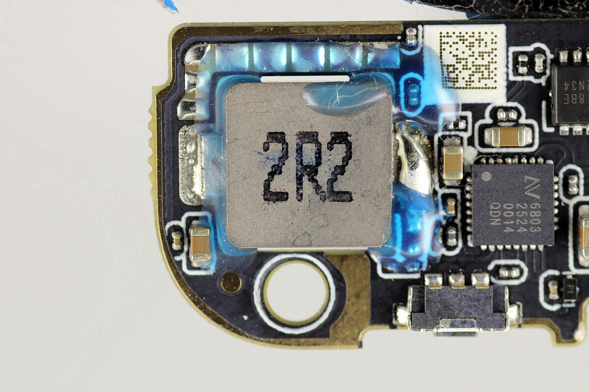 2.2μH合金电感贴片焊接,涂有蓝色胶水加固。