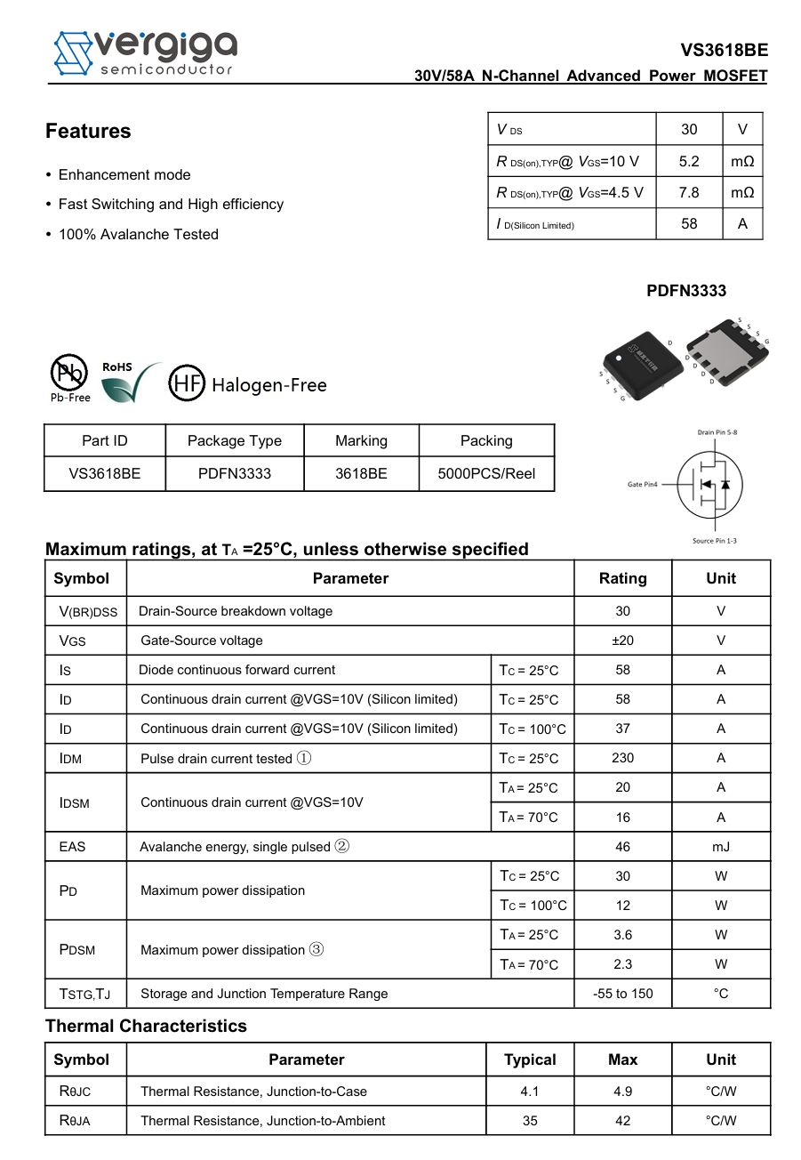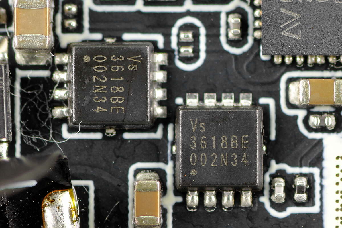 VBUS开关管来自威兆半导体,型号VS3618BE,NMOS,耐压30V,导阻5.2mΩ,采用PDFN3333封装。