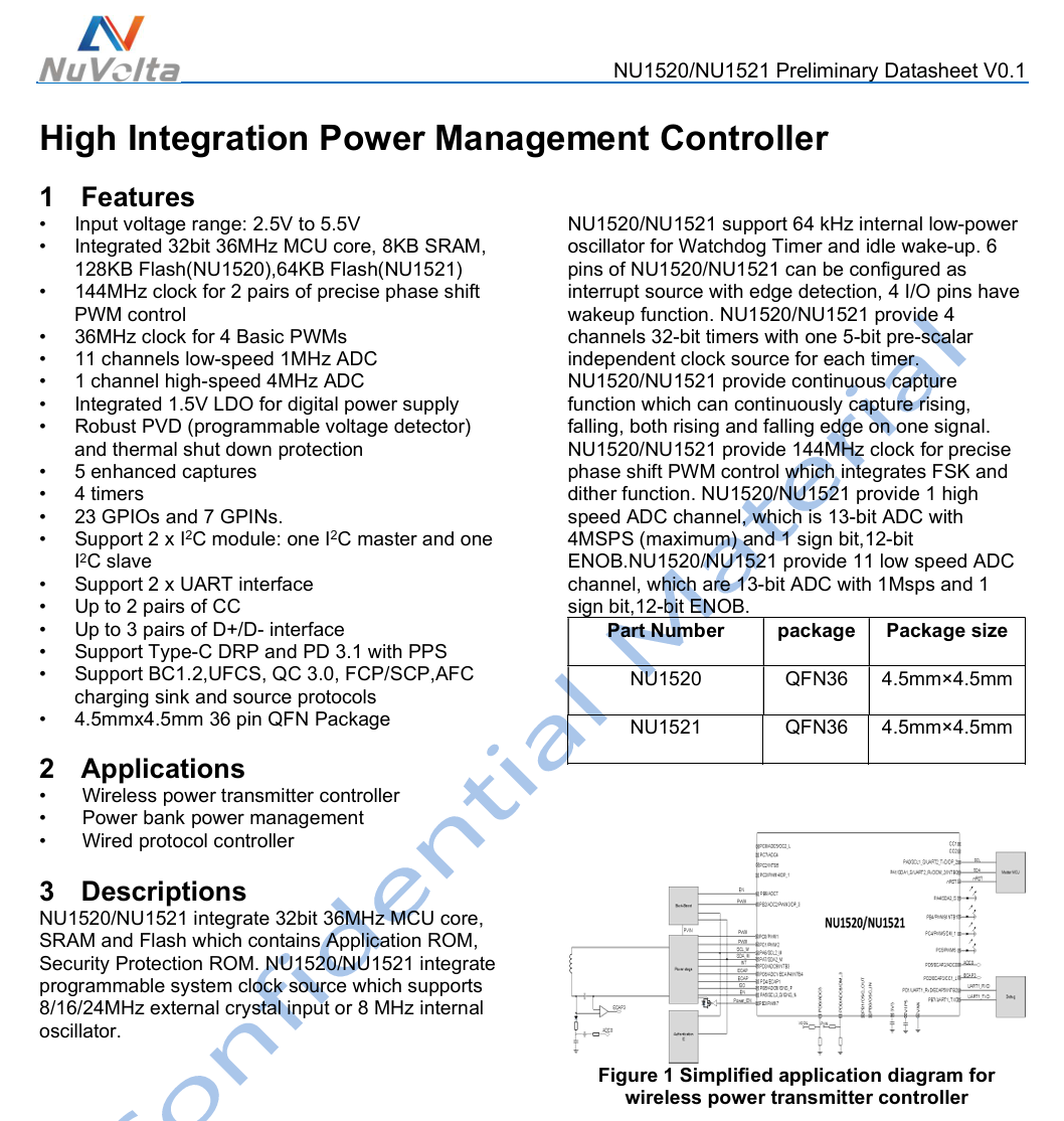 NU1520支持2.5-5.5V工作电压,具备I2C主从接口,具备两个UART接口,支持PD3.1快充协议,并支持BC1.2、UFCS、QC3.0、SCP/FCP和AFC快充协议,具备过热关闭保护,采用QFN36封装。