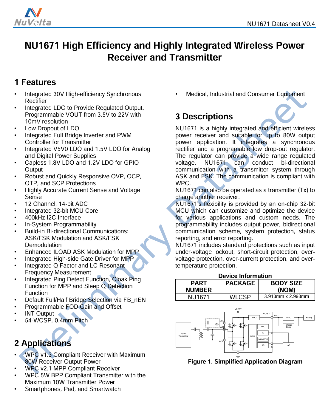 NU1671内部集成32位MCU,具备I2C通信接口,可编程输出功率,双向通信,系统保护,状态报告和错误报告。芯片集成欠压闭锁保护,短路保护,过电压过电流和过热保护,采用WLCSP封装。