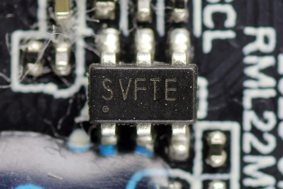 稳压芯片来自圣邦,丝印SVF,型号SGM2202-ADJ,支持36V输入电压,输出电流150mA,为可调输出电压版本。支持0.8-13.2输出电压范围,采用SOT-23-6封装。