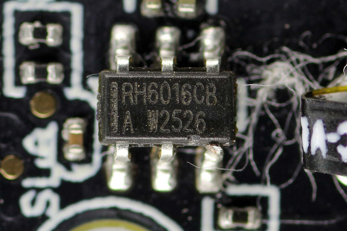 触摸检测芯片来自融和,型号RH6016CB,是一颗单通道触摸检测开关,芯片内置稳压模块,支持2.4-5.5V工作电压范围,采用SOT23-6封装。