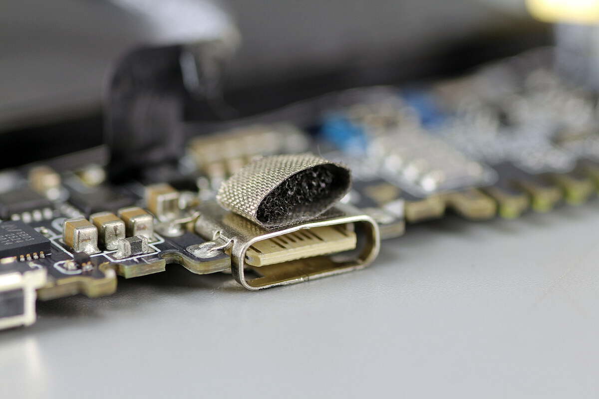 壳体对应USB-C母座位置点焊金属片,并粘贴导电布接地。