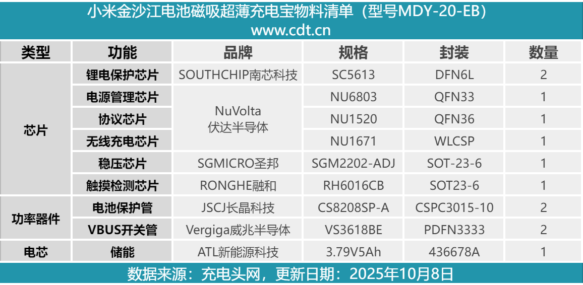 充电头网通过拆解了解到,小米金沙江充电宝采用铝合金外壳配合不锈钢盖板,通过胶水粘贴固定。壳体内部对应电池位置设有缓冲泡棉,并设有触摸检测贴片。充电宝内部采用伏达半导体方案,使用NU1520协议芯片搭配NU6803电源管理芯片进行电池充放电管理,并使用NU1671集成功率级芯片用于无线充电。