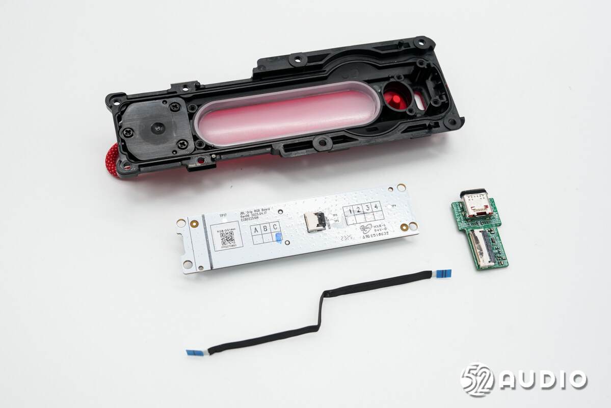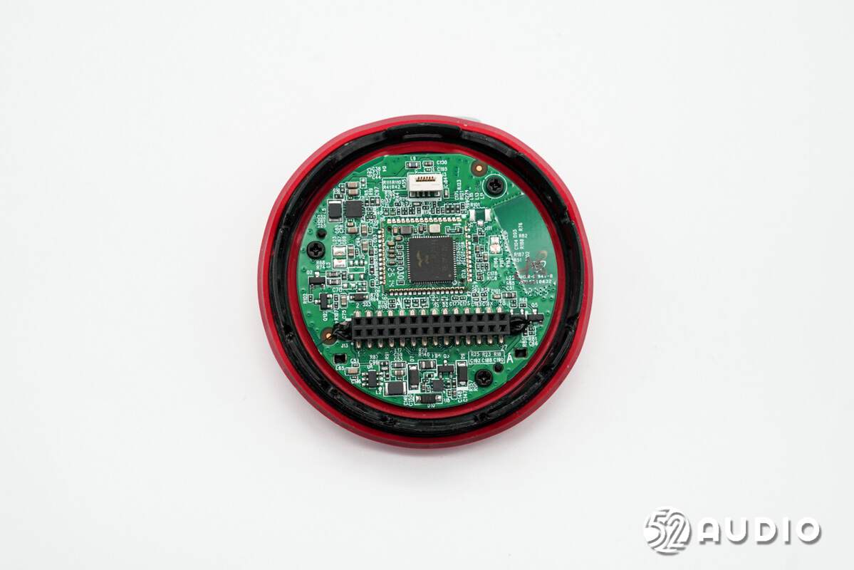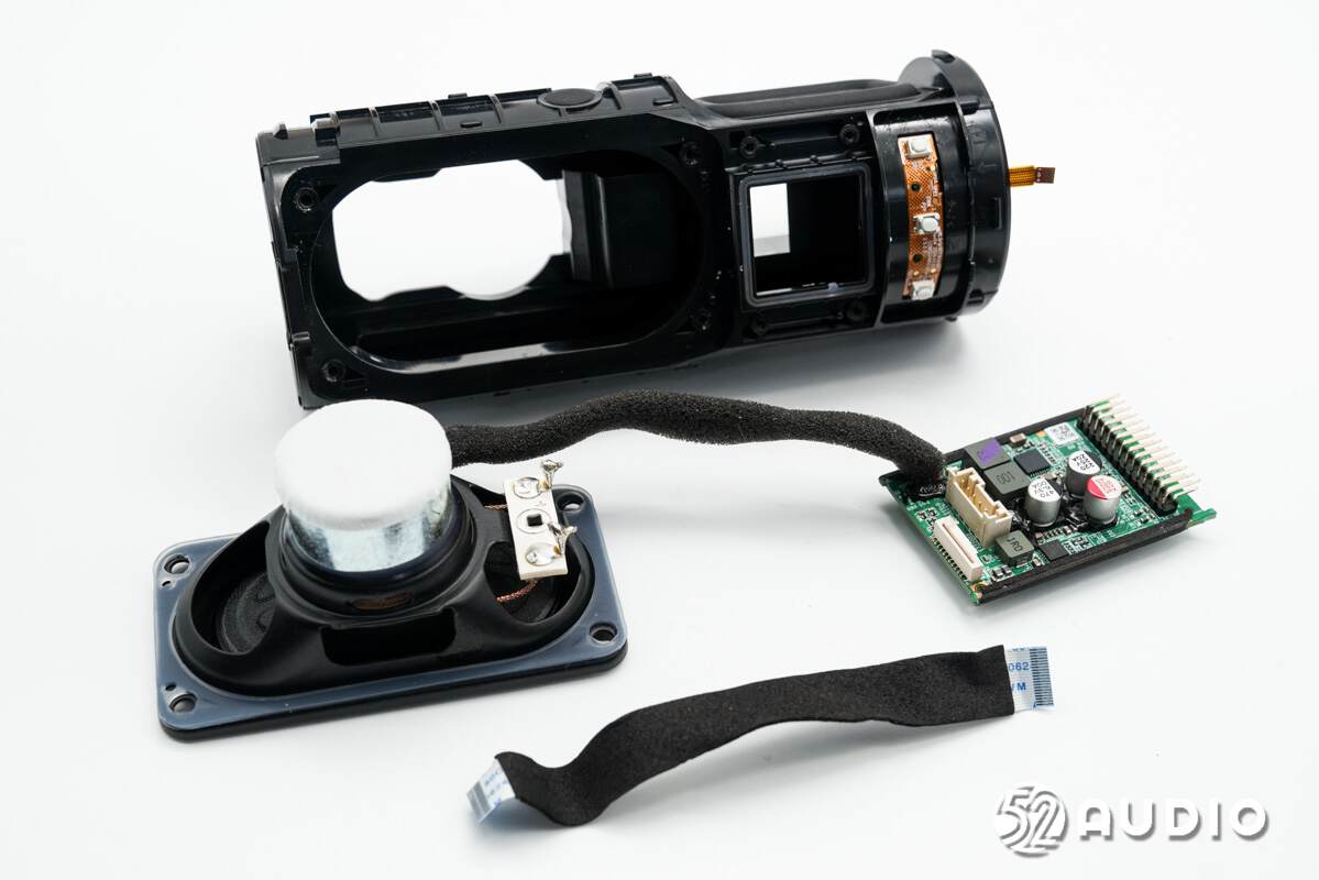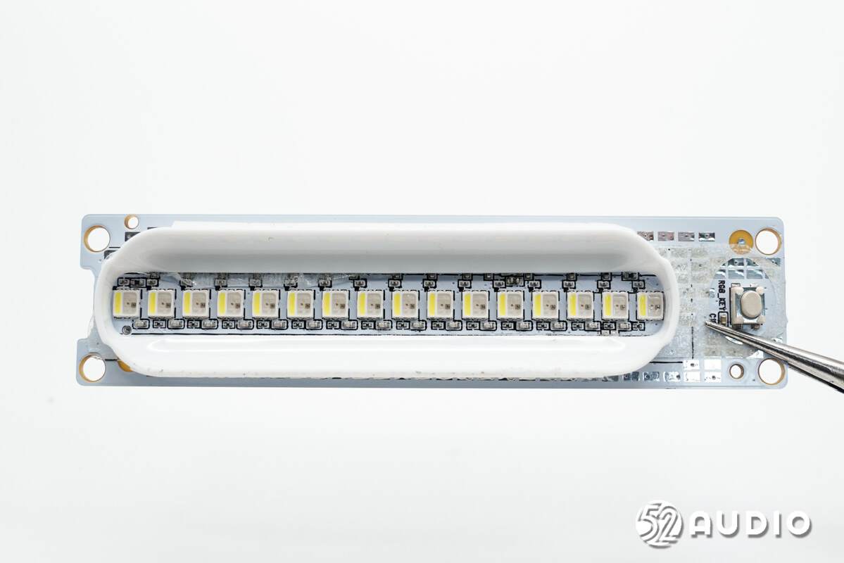 内部结构方面,体积虽小,但非常复杂,涵盖了扬声器、电池、主板、炫彩灯小板、功放小板、电源输入小板、功能按键等许多模组。主要配置上,搭载了80*43mm赛道型喇叭+无源辐射振膜,采用了豪鹏2600mAh/3.85V可充式锂离子电池组,炫彩灯小板设置16颗RGB LED灯珠提供光源。