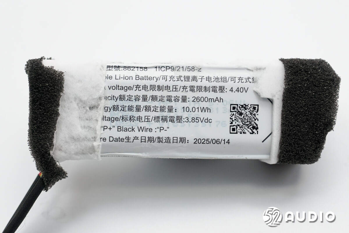 音箱内置可充式锂离子电池组,型号:862158,充电限制电压:4.40V,额定容量:2600mAh,额定能量:10.01Wh,标称电压:3.85V。