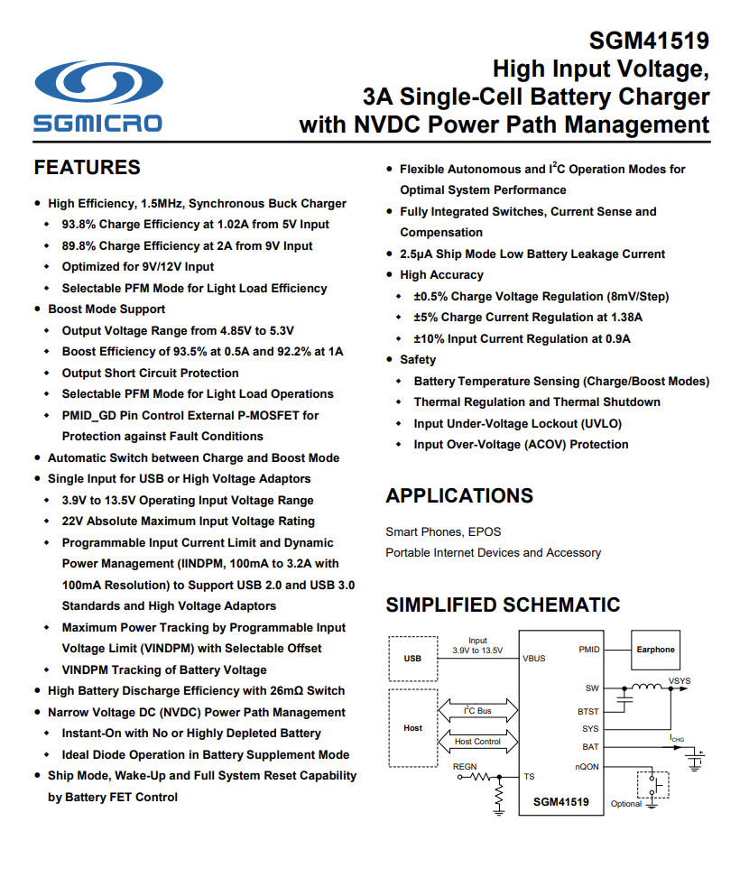 SGMICRO圣邦微SGM41519是一款电池充电器和系统电源路径管理设备,带有集成转换器和电源开关,适用于单节锂离子或锂聚合物电池。这种高度集成的3A设备能够快速充电,并支持适用于智能手机、平板电脑和便携式系统的宽输入电压范围。I2C编程使其成为一种非常灵活的电源和充电器设计解决方案。
