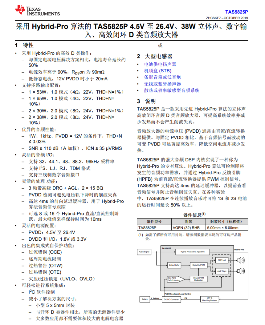 德州仪器TAS5825P的强大音频DSP内核实现了一种称为Hybrid-Pro的专有算法。Hybrid-Pro算法可检测即将发生的音频功率需求,并通过Hybrid-Pro反馈引脚 (HPFB) 为前直流/直流转换器提供PWM控制信号。TAS5825P支持高达4ms的延迟缓冲器,以提前查看音频信号并防止音频削波失真。
