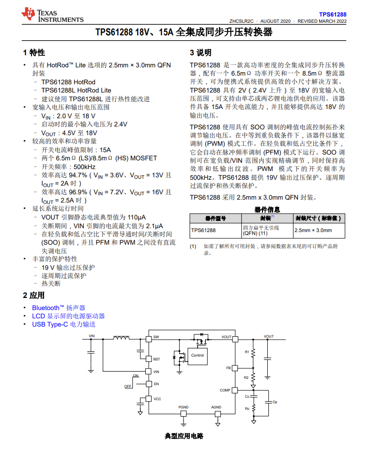 TI德州仪器TPS61288同步升压转换器,配有一个6.5mΩ功率开关和一个8.5mΩ整流器开关,具有2V(2.4V上升)至18V的宽输入电压范围,可支持由单芯或两芯锂电池供电的应用。该器件具备15A开关电流能力,并且能够提供高达18V的输出电压。